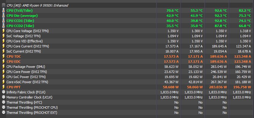 При этом методе игнорируется лимит EDC, лимит TDC настраивается исходя из возможностей VRM, какой ток в амперах материнская плата может максимально выдать не перегревая VRM, лимит PPT это максимальное потребление процессора, особенно актуально если система охлаждения очень инертная. 5900X/5950X упрутся в температурный лимит в 90°С на самом горячем CCD, 5600X/5800X в 95°С, эти значения можно уменьшить при помощи настройки Platform Thermal Throttle Limit. Последние 5°С до этого лимита дают приличные пенальти к бусту.