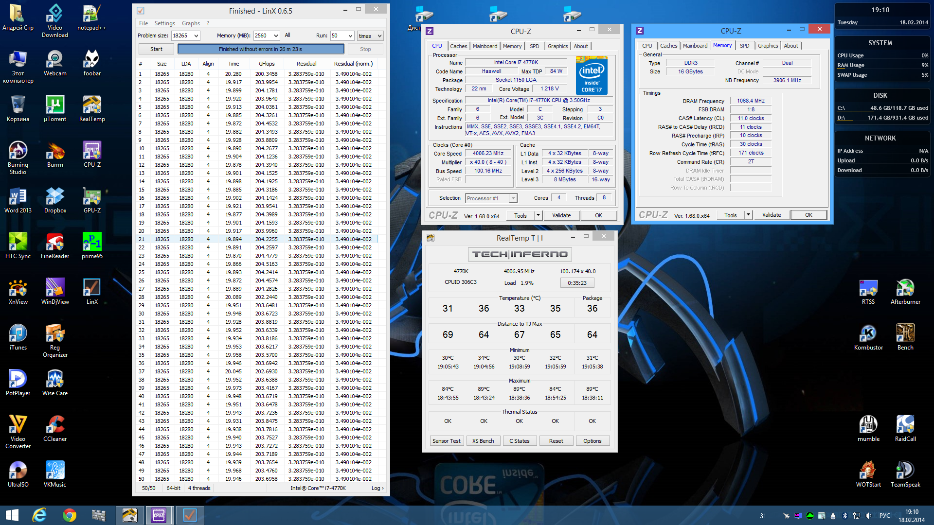 Какой там стабилен,у меня 4.2Гц при 1.200V до сотки почти сразу греется под LinX 0.6.5 .
