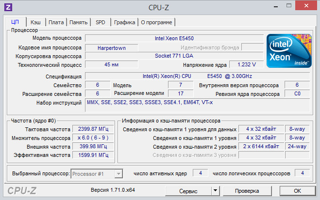 Пришел сегодня Е5450 (E0). Сразу же автоматом после включения встал на 400MHz и множитель 8, я подправил множитель до 9, теперь E5450 работает на частоте 3.6GHz, оперативку не гнал поставил 1:1=800MHz. Все напряжения выставлены на авто. Видяха работает на ура, DA:I почти летает) Макс температура в Евересте при стресс тесте 58 градусов. Без нагрузки(веб-сёрфинг и тд) температура еле доходит до 28-35 градусов. Cinebench правда показал маловато результатов, но учитывая разномастность ОЗУ и винт на котором стоит 64 битная Windows 7 - это нормально) Прога RealTeam в нагрузке вообще показывает Distance to TJ Max почти 50(43-47). Без нагрузки 60-65. Вот тут вся инфа из CPUz. Пару скриншотов в приложении под спойлером) В общем я доволен результатом