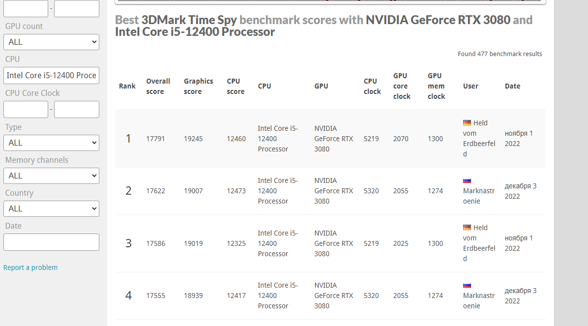 Тем временем 2место в мире по связке 12400 и 3080 и это на ддр4 и доске за 10к. 1 место там похоже на чиллере, у него температура на видяхе 30 градусов. ) и ддр5 6000 на доске за 22к.