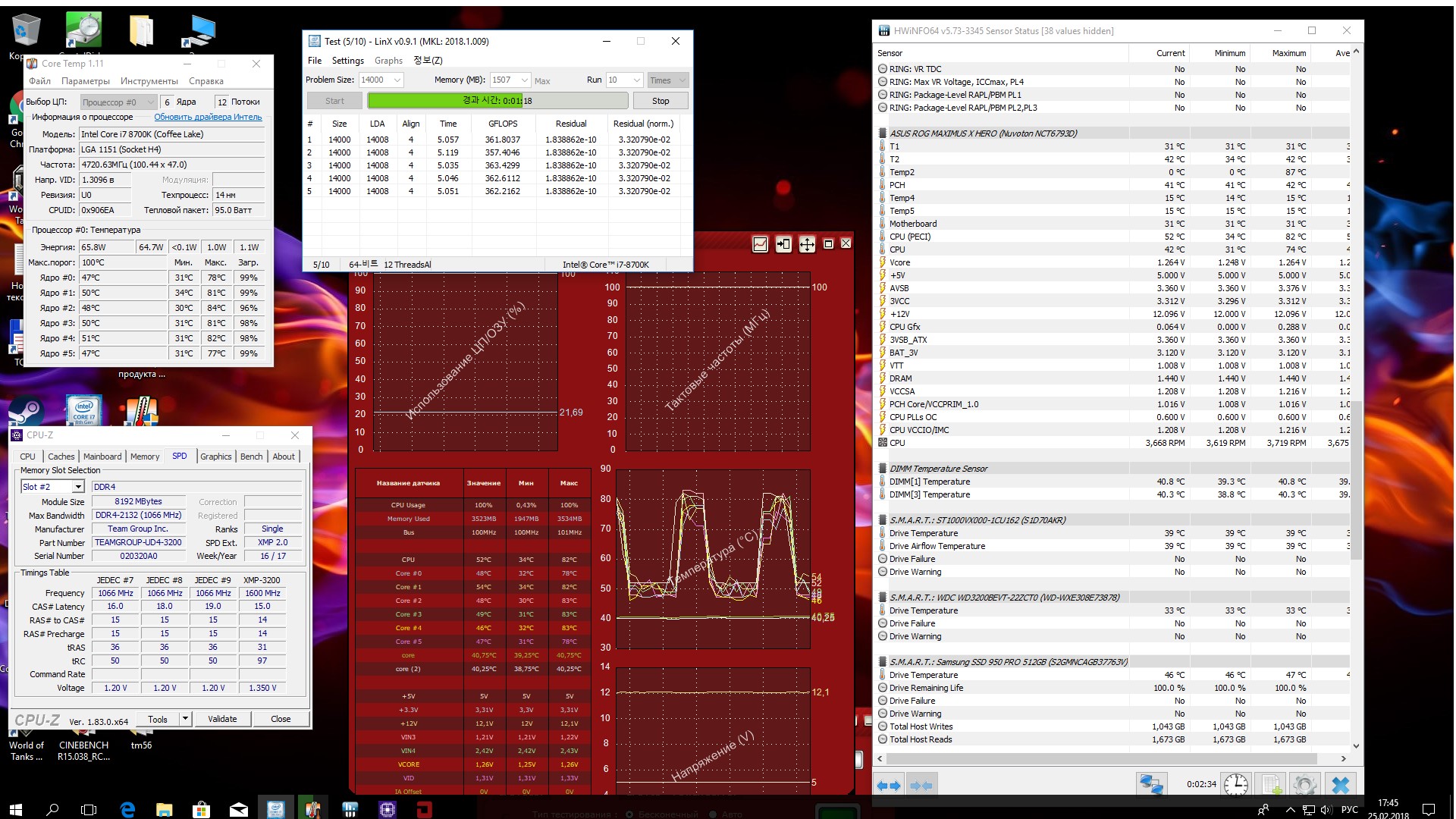 Полученный результат должен иметь следующий вид: Скриншот рабочего стола после прохождения >9 циклов (т.е. между 9 и 10 проходами). Вместе с LinX на рабочем столе должны быть развернуты CPU-Z (первая вкладка) и Core Temp, это обязательный минимум. Такой набор программ даст информацию о напряжении и температурах под нагрузкой-простоем. По желанию можете добавить другие программы, показывающие дополнительную информацию о вашей системе, например третью вкладку CPU-Z, которая покажет модель материнской платы и версию BIOS. Пример результата разгона: Mad Max, 5100 МГц (AVX 0), i7-8086K, HT-ON, Cache 4700, Vcore=1.36V, Batch L805E123, Gigabyte Z370 Aorus Gaming 7 (bios F6), Be Quiet! Dark Rock Pro 4, ЖМ под HS, Windows 10 Pro 64-bit 1809, LinX 0.9.3 64bit.