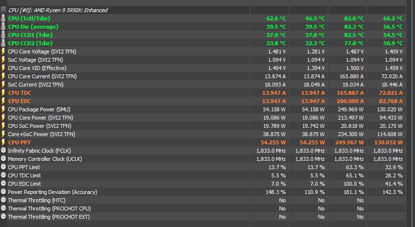 У тебя ppt max там 106W, какие еще 52 ? А вообще это разные нагрузки, если чо. В GB у тебя 1.46в было на одной малой (среди стапитцот прочих в гикбенче) нагрузок - вообще несравнимые вещи. Запустил бы просто СВ R20 mt, и сравнил бы. Нужна однородная нагрузка, mt, st, cpu-z чтоб сравнивать. И запости скрин с hwinfo, только полный, с эфф. частотами и в snapshot mode, и не забудь ресетнуть сенсоры после запуска бенча а скрин делай под конец (PrtScr клавиша)
