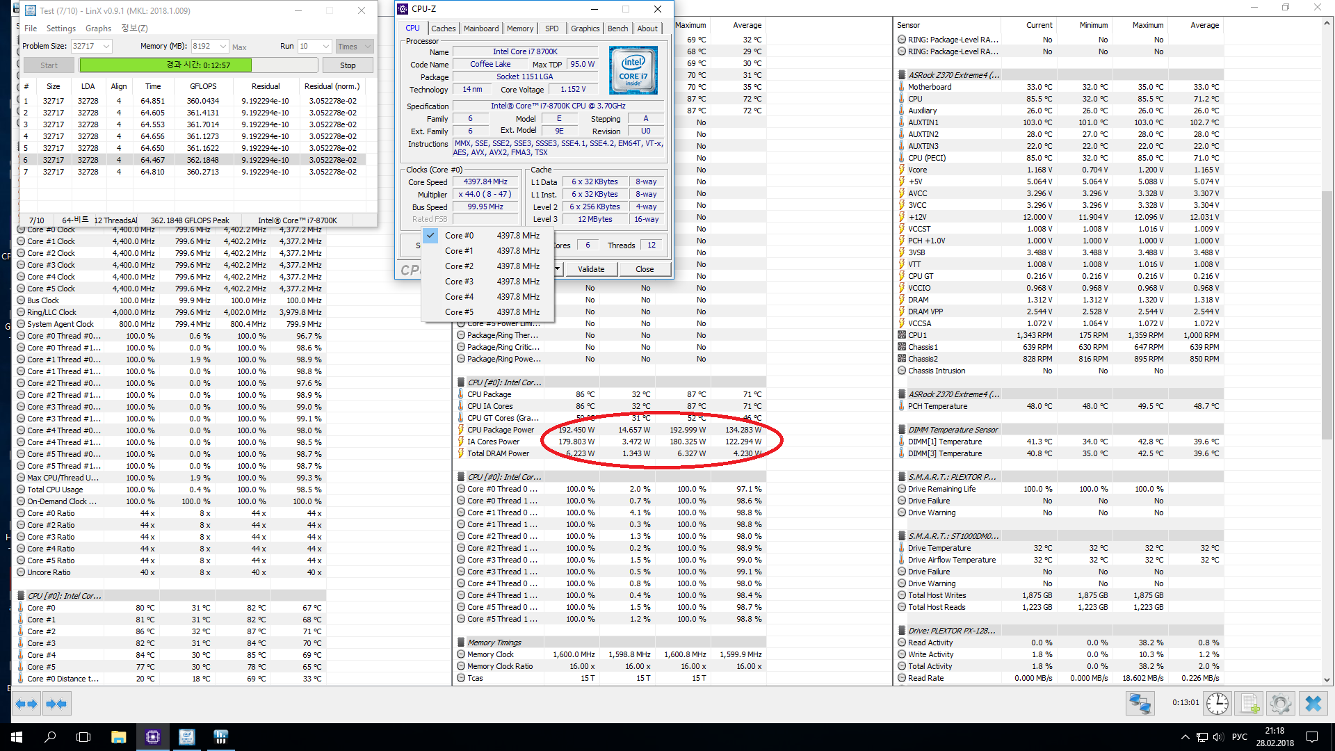Полученный результат должен иметь следующий вид: Скриншот рабочего стола после прохождения >9 циклов (т.е. между 9 и 10 проходами). Вместе с LinX на рабочем столе должны быть развернуты CPU-Z (первая вкладка) и Core Temp, это обязательный минимум. Такой набор программ даст информацию о напряжении и температурах под нагрузкой-простоем. По желанию можете добавить другие программы, показывающие дополнительную информацию о вашей системе, например третью вкладку CPU-Z, которая покажет модель материнской платы и версию BIOS. Пример результата разгона: Mad Max, 5100 МГц (AVX 0), i7-8086K, HT-ON, Cache 4700, Vcore=1.36V, Batch L805E123, Gigabyte Z370 Aorus Gaming 7 (bios F6), Be Quiet! Dark Rock Pro 4, ЖМ под HS, Windows 10 Pro 64-bit 1809, LinX 0.9.3 64bit.