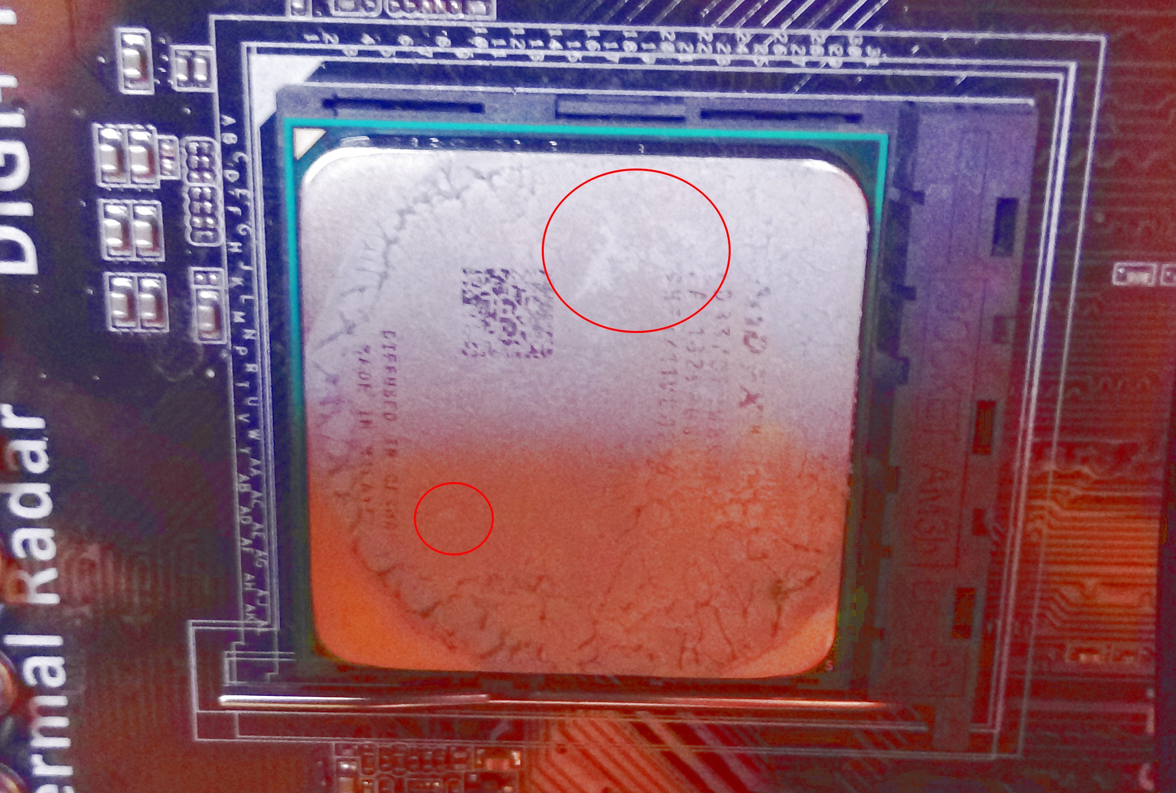Вот тут я наблюдаю высохшую термопасту, это признак перегрева в этом месте.