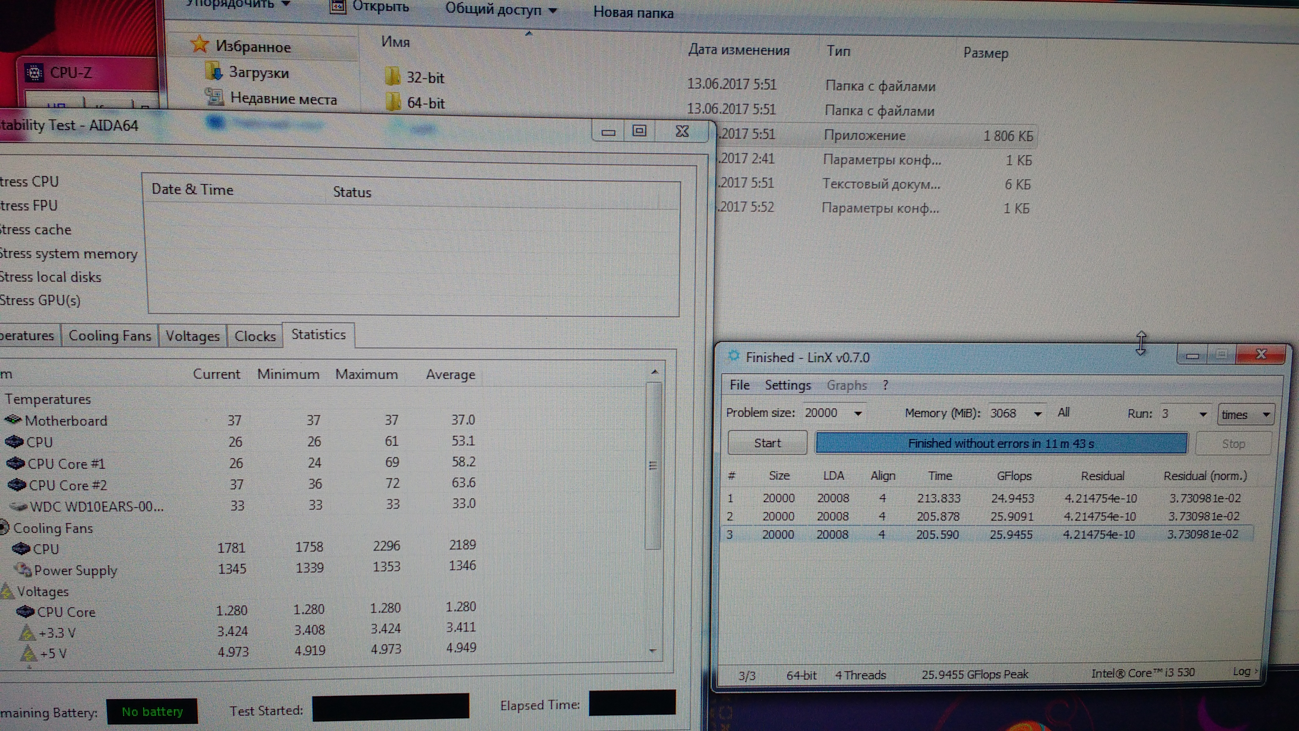 По поводу теста, результат грустный... Как и писал разогнал i3 530 до 4Ггц при напряжение около 1.3 Вольта, также хочу отметить, что i3 тоже оказался проблемный, разброс температуры по ядрам в простое до 14 градусов, но это не удивительно...После покупки комплекта, я снял радиатор и это были слезы, какие-то мелкие ошметки засохшей пасты, покрывали площадь процессора в сумме не более 10%, как следствие наверное под крышкой тоже паста высохла из-за перегревов. Ниже результаты тестов: