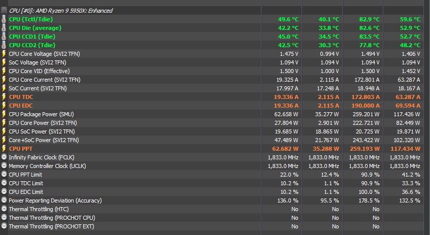 При этом методе игнорируется лимит EDC, лимит TDC настраивается исходя из возможностей VRM, какой ток в амперах материнская плата может максимально выдать не перегревая VRM, лимит PPT это максимальное потребление процессора, особенно актуально если система охлаждения очень инертная. 5900X/5950X упрутся в температурный лимит в 90°С на самом горячем CCD, 5600X/5800X в 95°С, эти значения можно уменьшить при помощи настройки Platform Thermal Throttle Limit. Последние 5°С до этого лимита дают приличные пенальти к бусту.