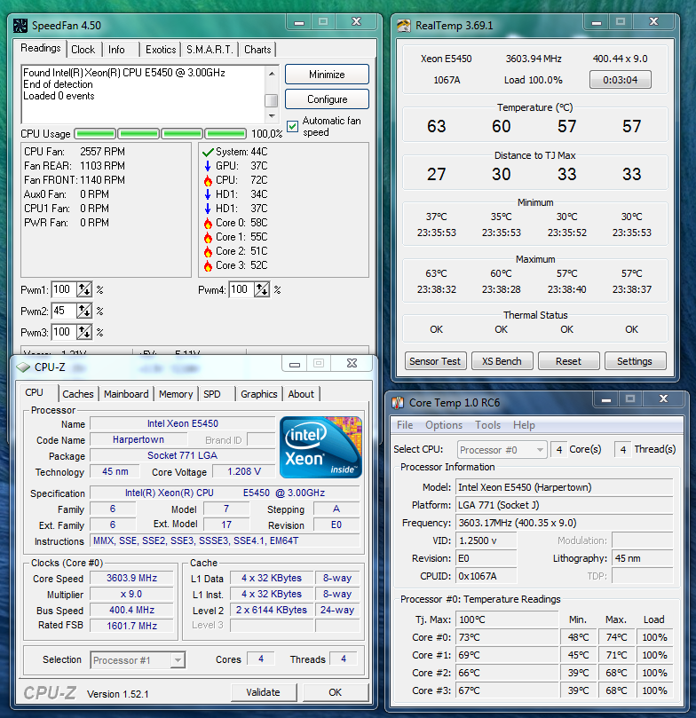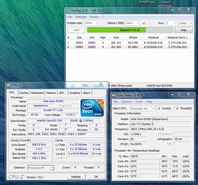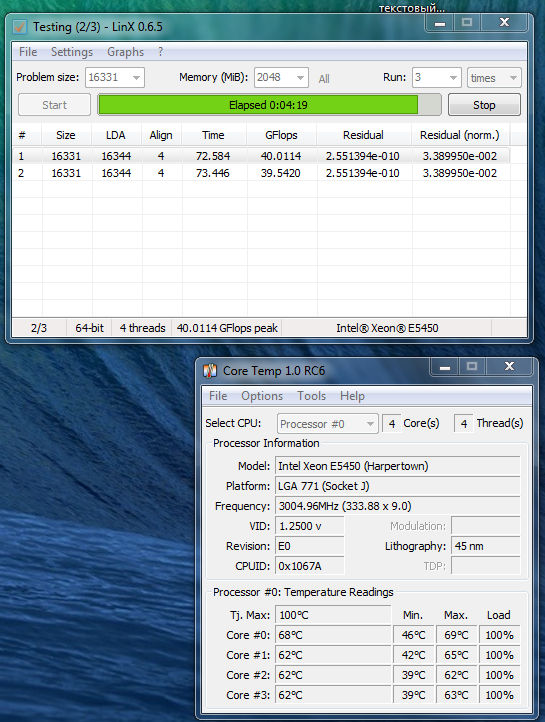 Поднял еще напряжение, как посоветовал DigiMakc, помогло, теперь линкс проходит, завтра буду подбирать минимально-стабильное. Но появился еще вопрос, мерил температуру разными средствами и что-то совсем не сошлись показания. У RealTemp и CoreTemp разница чуть ли не в 10 градусов, хотя по прочтении фака и темы я понял что они с одних датчиков берут, да вроде и на старом проце е7500 одинаково показывали. Так кому верить-то? А по поводу виртуализации, вроде чипсет Р35 ее не поддерживает, так что похоже вопрос снят