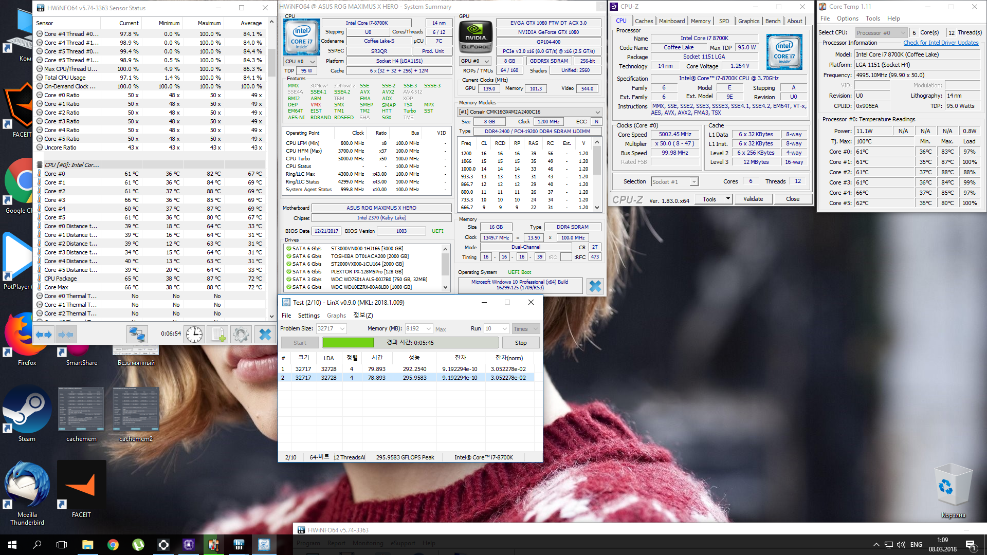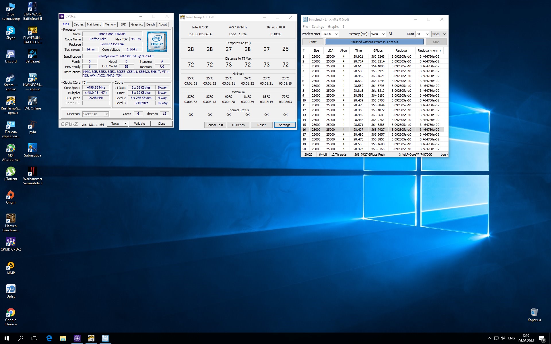 Полученный результат должен иметь следующий вид: Скриншот рабочего стола после прохождения >9 циклов (т.е. между 9 и 10 проходами). Вместе с LinX на рабочем столе должны быть развернуты CPU-Z (первая вкладка) и Core Temp, это обязательный минимум. Такой набор программ даст информацию о напряжении и температурах под нагрузкой-простоем. По желанию можете добавить другие программы, показывающие дополнительную информацию о вашей системе, например третью вкладку CPU-Z, которая покажет модель материнской платы и версию BIOS. Пример результата разгона: Mad Max, 5100 МГц (AVX 0), i7-8086K, HT-ON, Cache 4700, Vcore=1.36V, Batch L805E123, Gigabyte Z370 Aorus Gaming 7 (bios F6), Be Quiet! Dark Rock Pro 4, ЖМ под HS, Windows 10 Pro 64-bit 1809, LinX 0.9.3 64bit.