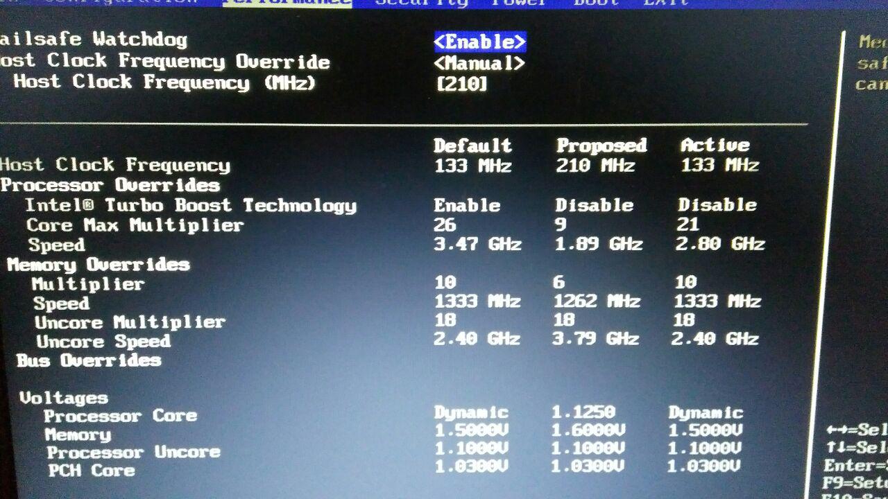 на руках Intel DP55SB 1156 и Xeon x3460 (аналог i7-860) вопрос такой, достаточно что либо сдвинуть на 1-2 шага в настройках разгона, сразу после перезагрузки выскакивает надпись, которая даёт или дефолт сделать или уйти в биос.. как обойти?
