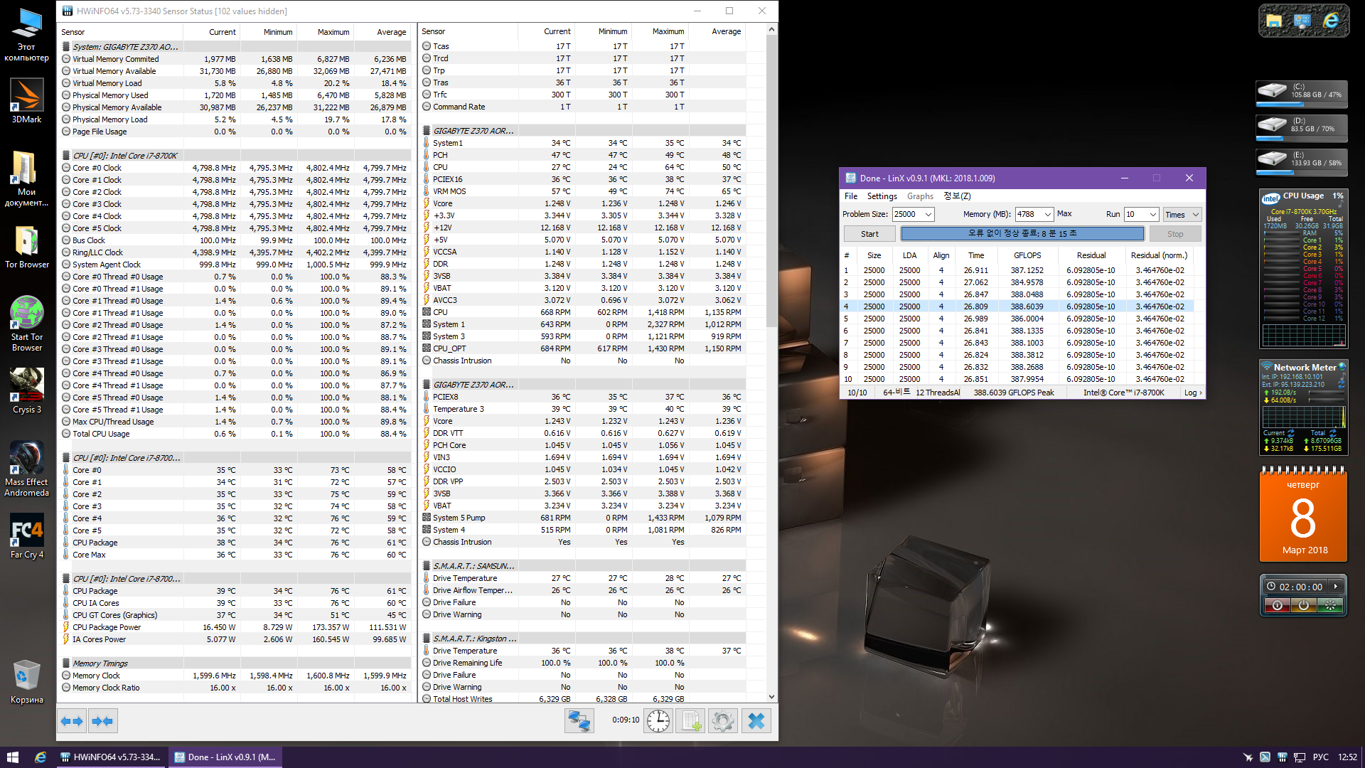 Полученный результат должен иметь следующий вид: Скриншот рабочего стола после прохождения >9 циклов (т.е. между 9 и 10 проходами). Вместе с LinX на рабочем столе должны быть развернуты CPU-Z (первая вкладка) и Core Temp, это обязательный минимум. Такой набор программ даст информацию о напряжении и температурах под нагрузкой-простоем. По желанию можете добавить другие программы, показывающие дополнительную информацию о вашей системе, например третью вкладку CPU-Z, которая покажет модель материнской платы и версию BIOS. Пример результата разгона: Mad Max, 5100 МГц (AVX 0), i7-8086K, HT-ON, Cache 4700, Vcore=1.36V, Batch L805E123, Gigabyte Z370 Aorus Gaming 7 (bios F6), Be Quiet! Dark Rock Pro 4, ЖМ под HS, Windows 10 Pro 64-bit 1809, LinX 0.9.3 64bit.