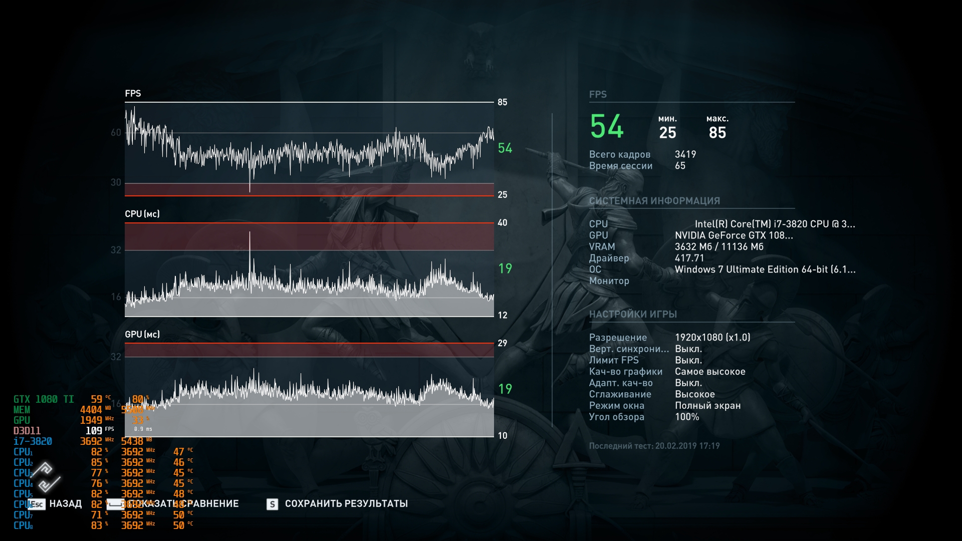 1080ti уже не тянет в полной загрузке при 2х сглажке. А вот стоковый i7 3820 c 2х канальной памятью 1866 cl12 тянет её.