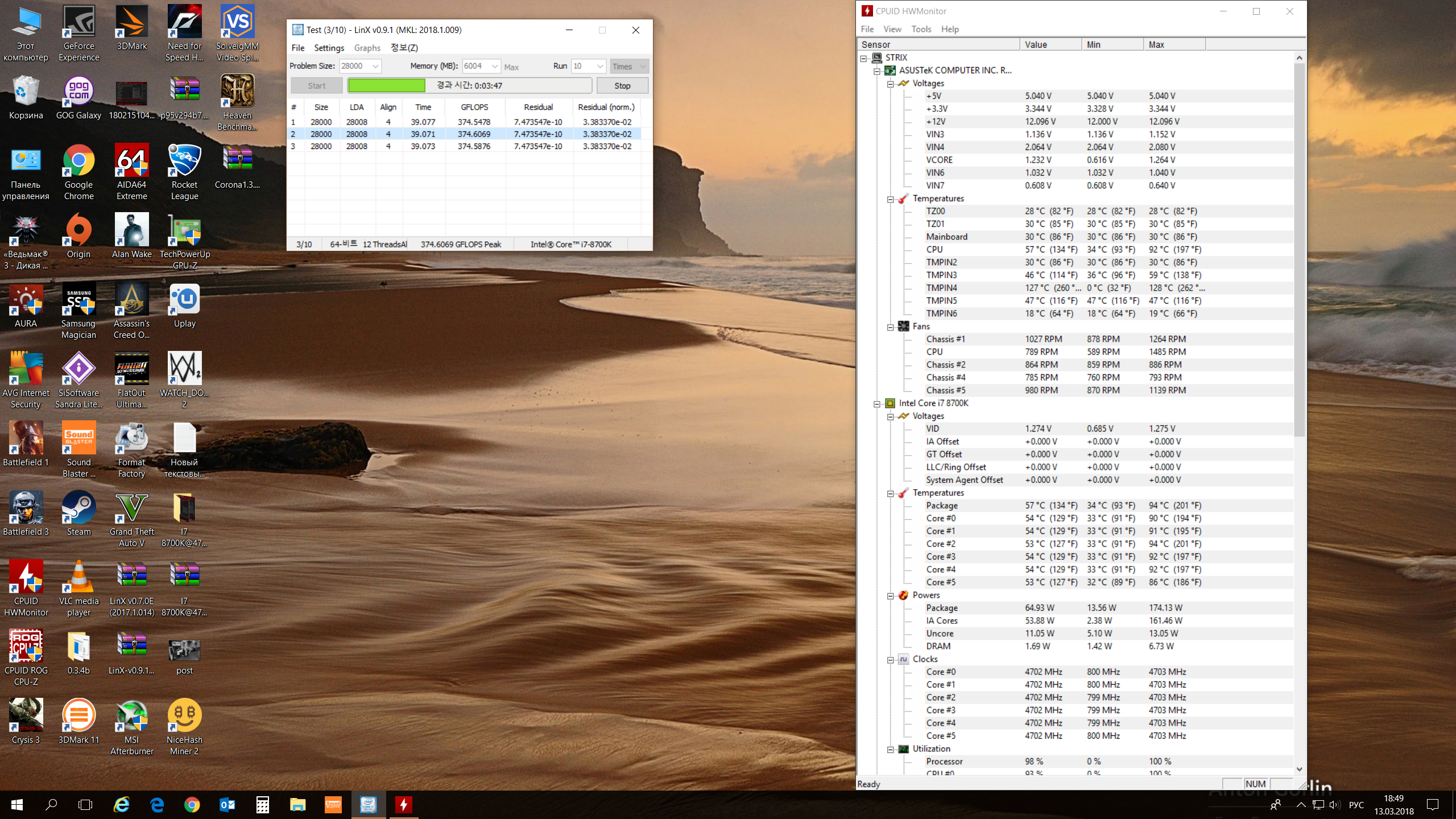 Полученный результат должен иметь следующий вид: Скриншот рабочего стола после прохождения >9 циклов (т.е. между 9 и 10 проходами). Вместе с LinX на рабочем столе должны быть развернуты CPU-Z (первая вкладка) и Core Temp, это обязательный минимум. Такой набор программ даст информацию о напряжении и температурах под нагрузкой-простоем. По желанию можете добавить другие программы, показывающие дополнительную информацию о вашей системе, например третью вкладку CPU-Z, которая покажет модель материнской платы и версию BIOS. Пример результата разгона: Mad Max, 5100 МГц (AVX 0), i7-8086K, HT-ON, Cache 4700, Vcore=1.36V, Batch L805E123, Gigabyte Z370 Aorus Gaming 7 (bios F6), Be Quiet! Dark Rock Pro 4, ЖМ под HS, Windows 10 Pro 64-bit 1809, LinX 0.9.3 64bit.