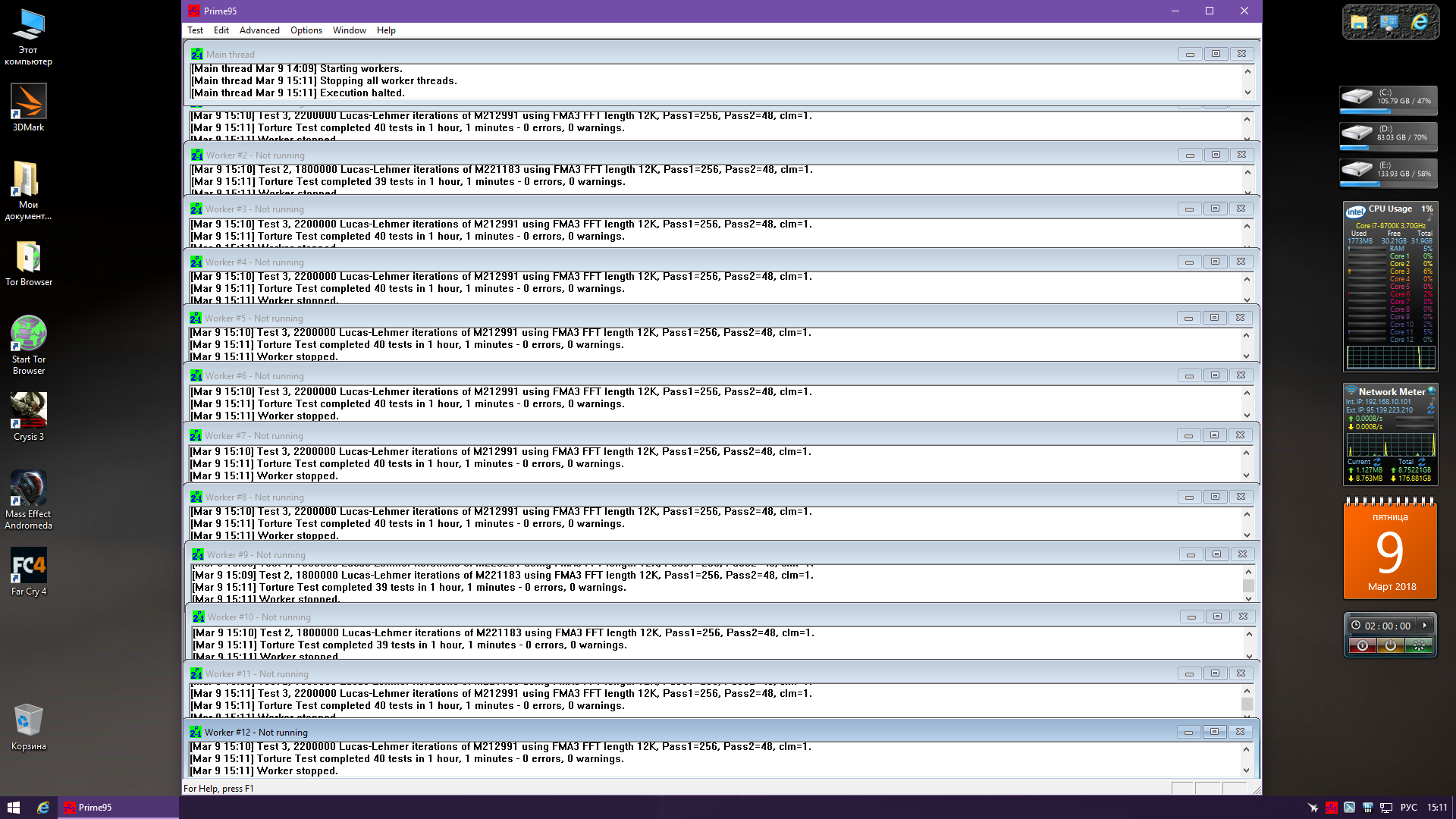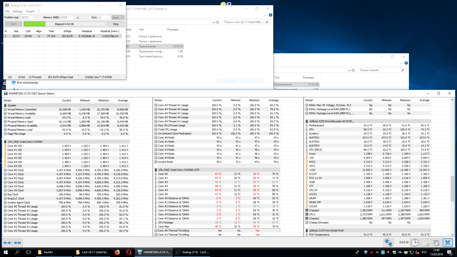 Полученный результат должен иметь следующий вид: Скриншот рабочего стола после прохождения >9 циклов (т.е. между 9 и 10 проходами). Вместе с LinX на рабочем столе должны быть развернуты CPU-Z (первая вкладка) и Core Temp, это обязательный минимум. Такой набор программ даст информацию о напряжении и температурах под нагрузкой-простоем. По желанию можете добавить другие программы, показывающие дополнительную информацию о вашей системе, например третью вкладку CPU-Z, которая покажет модель материнской платы и версию BIOS. Пример результата разгона: Mad Max, 5100 МГц (AVX 0), i7-8086K, HT-ON, Cache 4700, Vcore=1.36V, Batch L805E123, Gigabyte Z370 Aorus Gaming 7 (bios F6), Be Quiet! Dark Rock Pro 4, ЖМ под HS, Windows 10 Pro 64-bit 1809, LinX 0.9.3 64bit.