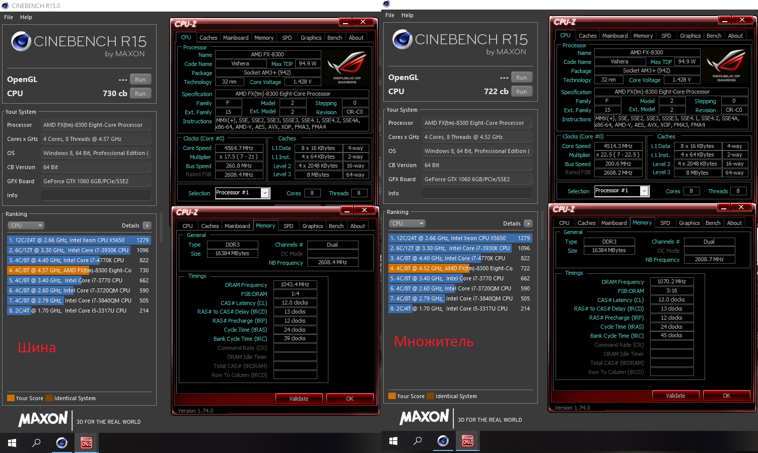 А вот на примере Cinebench R-15 по шине 730 по множителю 722,что объясняется разницей частоты ядра на 50мгц в пользу шины(730\4570*4520=722)