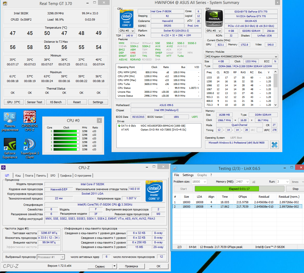 ДЛЯ BuLkaRS. На форуме писано/переписано: 1.СБРОСЬТЕ BIOS в дефолт; 2.установите "ASUS AI Suite 3 V1.00.96"; 3.этой утилитой сделайте АВТОРАЗГОН; 4.ВЫБЕРИТЕ предложенный разгон; 5.ОТ НЕГО и "пляшите", выбирая частоту CPU/кеша, Vcore+остальные напряжения, учитывая приемливую для Вас температуру. *мониторьте параметры ОДНОЙ утилитой, а не "целым стадом утилит_они мешают друг другу; для видях даже было предупреждение_можно угробить напряжением "; HWiNFO хватает.