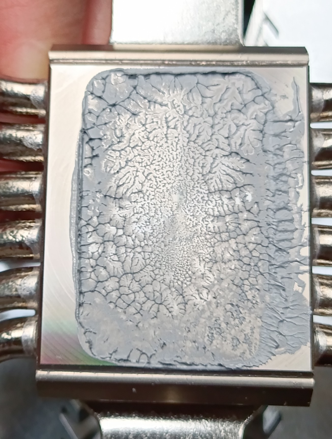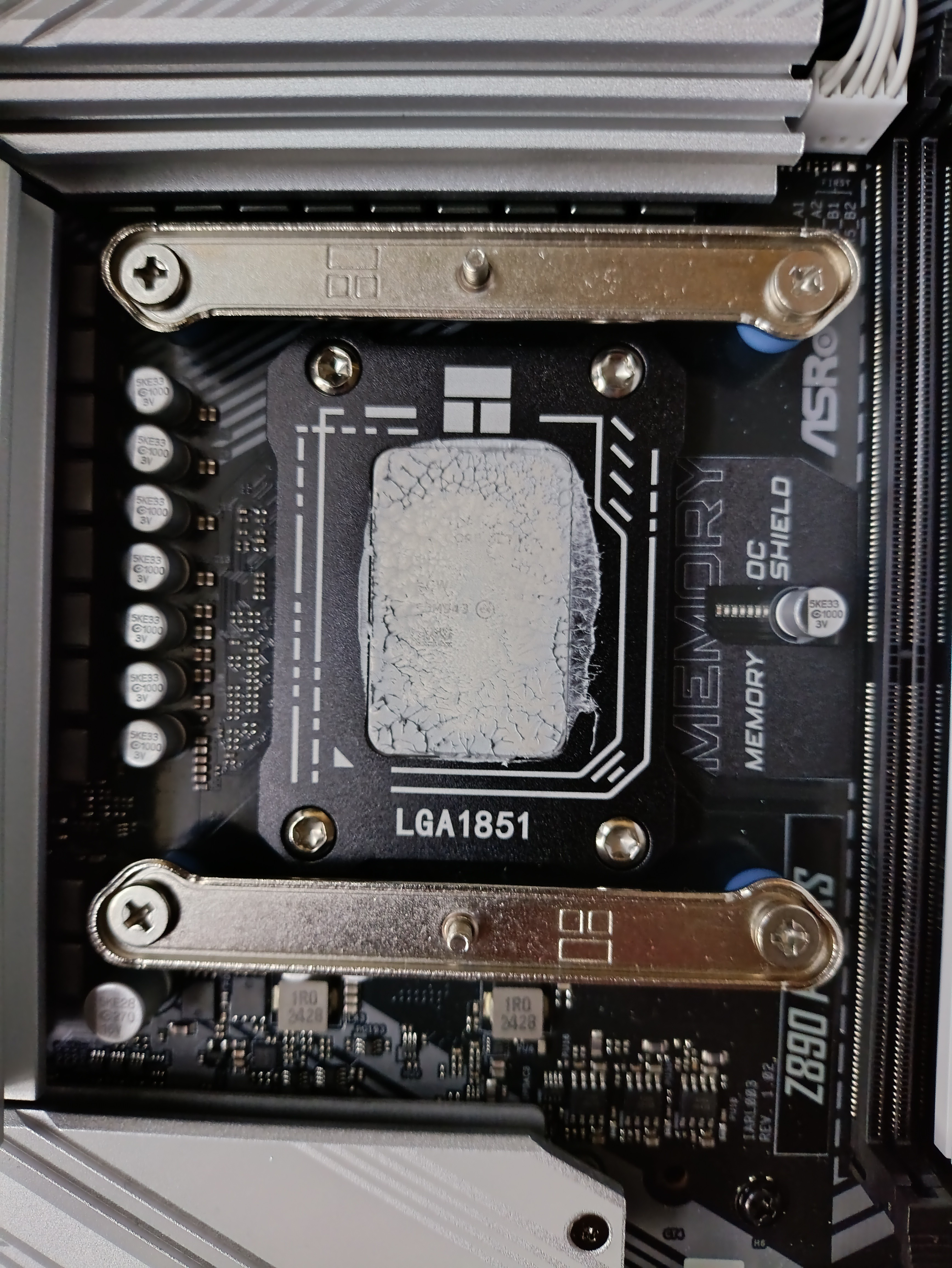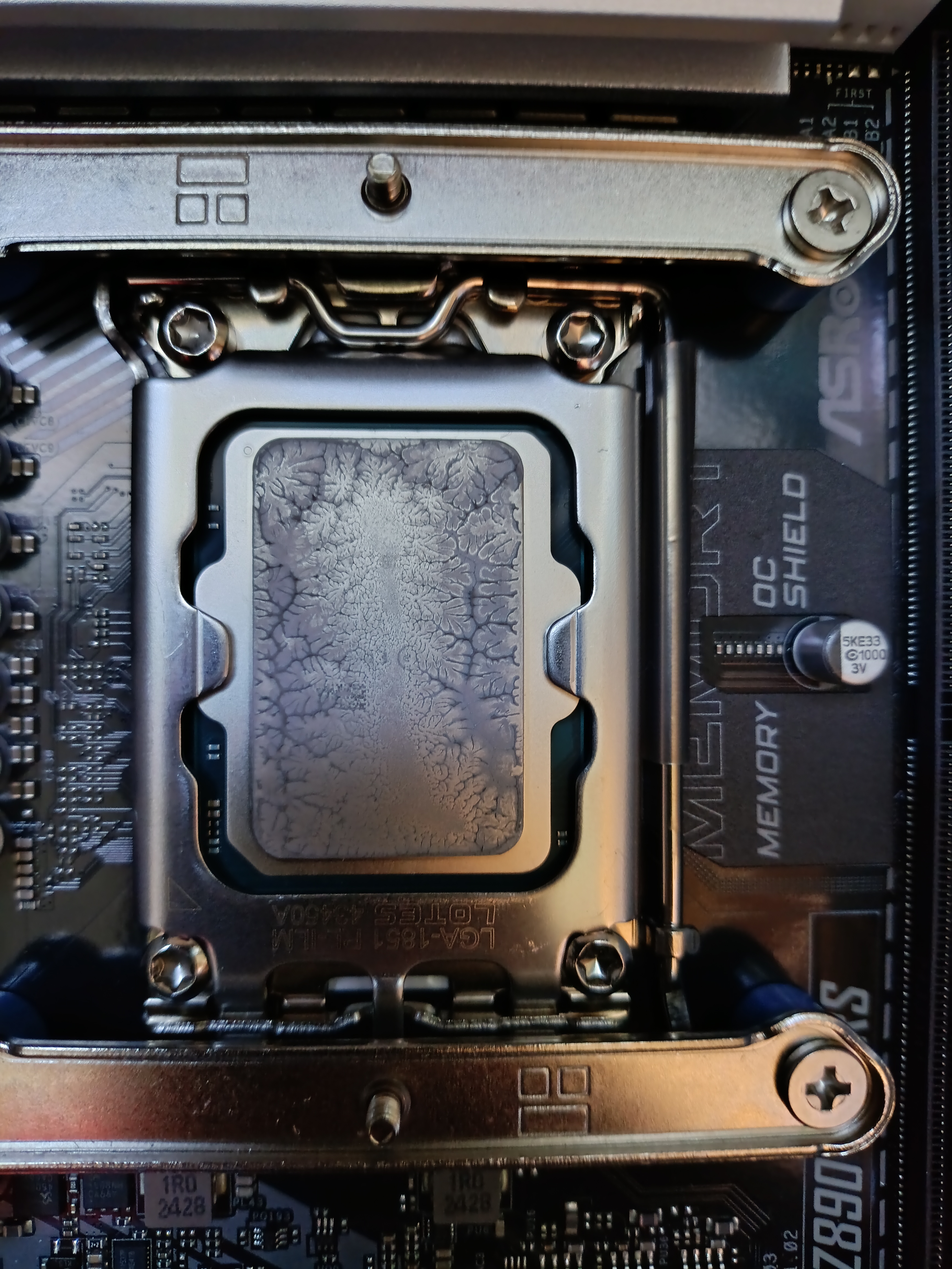 В общем ещё раз перебрал, почистил рамку от пасты, отпечатки ниже, единственное что изменилось - перешёл на ручной разгон с 7600 36 46 46 46 вместо хмп, дало снижение темпы на 2 градуса вниз от хмп, плюс термопасту взял tf7 боксовую, она липкая ее тонким слоем вместо мх4, в итоге дало снижение ещё на два градуса до 94 по макс темпе E ядра. Рамка затянута двумя пальчиками, момент затяжки даже чуть меньше чем асрок протянул. Но люфта нет и дальше тянуть уже сопротивление растет, т.е. рамка упёрлась.
