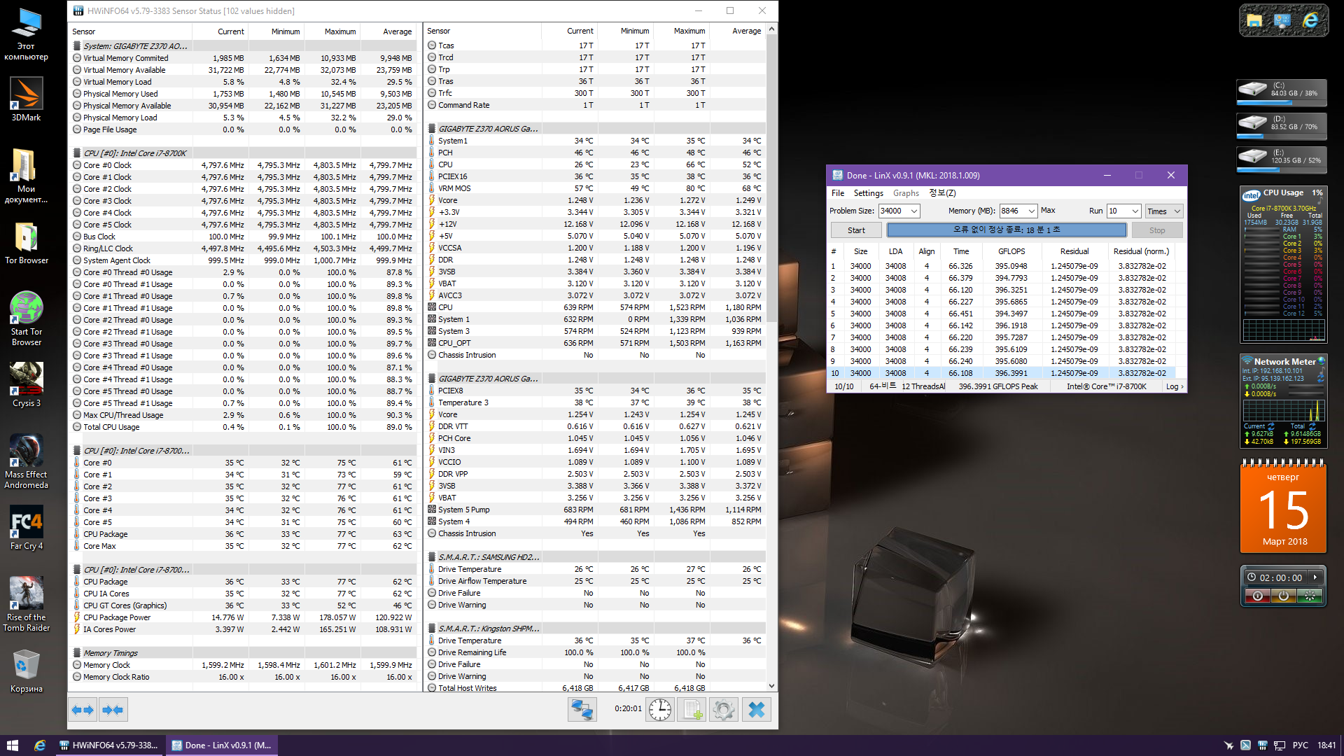 Полученный результат должен иметь следующий вид: Скриншот рабочего стола после прохождения >9 циклов (т.е. между 9 и 10 проходами). Вместе с LinX на рабочем столе должны быть развернуты CPU-Z (первая вкладка) и Core Temp, это обязательный минимум. Такой набор программ даст информацию о напряжении и температурах под нагрузкой-простоем. По желанию можете добавить другие программы, показывающие дополнительную информацию о вашей системе, например третью вкладку CPU-Z, которая покажет модель материнской платы и версию BIOS. Пример результата разгона: Mad Max, 5100 МГц (AVX 0), i7-8086K, HT-ON, Cache 4700, Vcore=1.36V, Batch L805E123, Gigabyte Z370 Aorus Gaming 7 (bios F6), Be Quiet! Dark Rock Pro 4, ЖМ под HS, Windows 10 Pro 64-bit 1809, LinX 0.9.3 64bit.