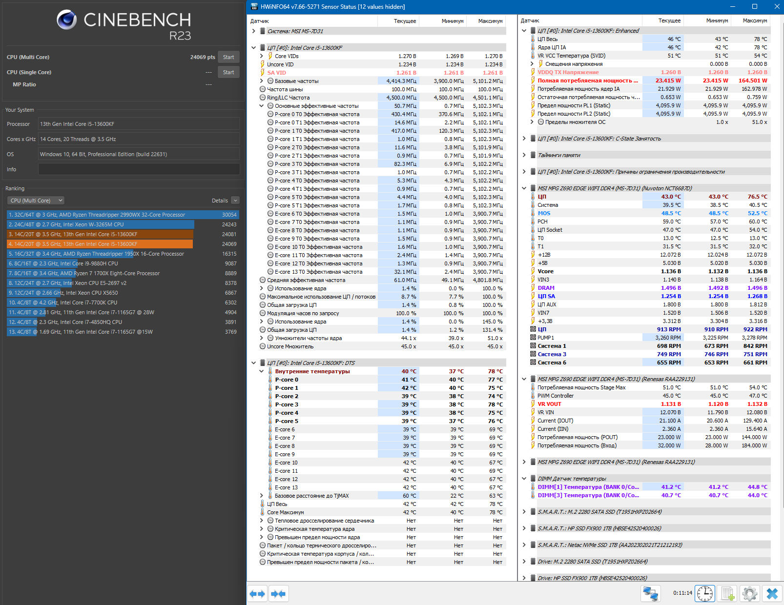 Погонял немного 13600KF на разгон. Настройки биос дефолтные, только для частот P-ядер 5400МГц и Е-ядер 4200МГц пришлось повысить Dynamic Vcore +0.1v, LLC авто. В итоге в Cinebench R23 24550 pts с максимальным потреблением 200W. На постоянку конечно ну на фиг такое потребление. Дальше не гнал, но 5500 думаю возьмёт. Единственное, остаётся открытым 1 вопрос. Почему не снижается энергопотребление в простое. Здесь многие выкладывают скрины из HWiNFO, где полная потребляемая мощность снижается в простое до 5-6W, даже в разгоне. У меня же этот показатель не снижается ниже 25W даже без разгона. То ли проблема с материнской платой, то ли процессор бракованный.