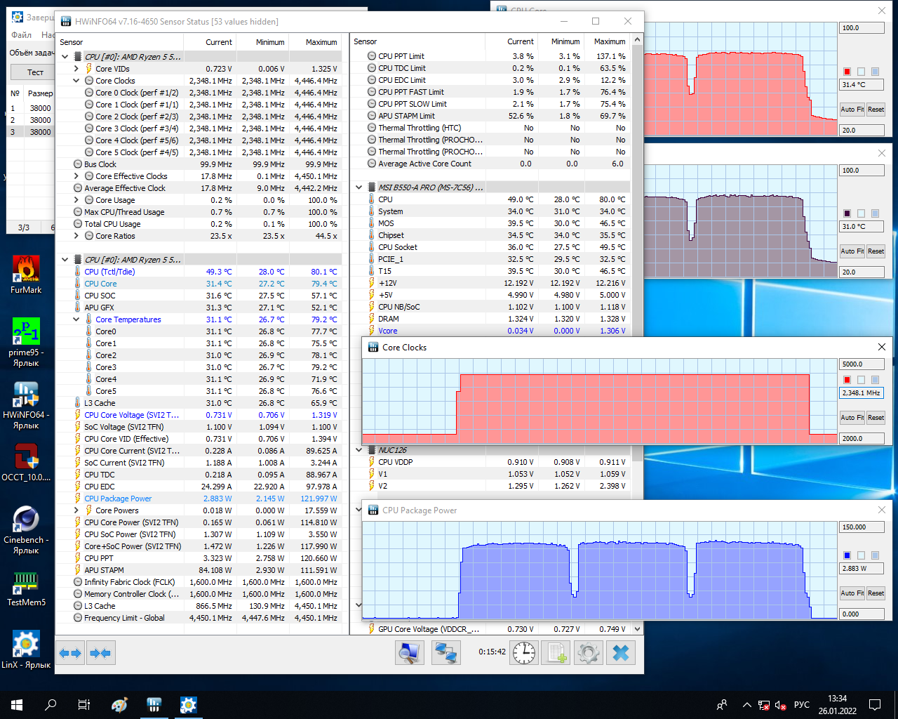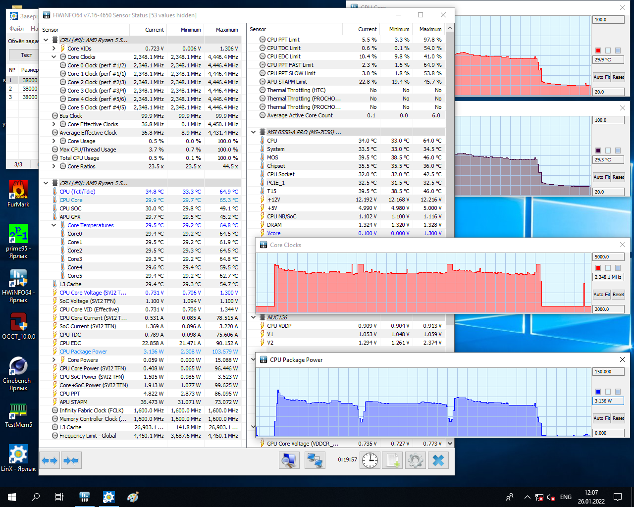 Товарищи, спрошу в профильной ветке по APU. Раз уж попался в руки 5600G + B550 чипсет и пока дали время поразвлекаться. У меня на этой системе выходит, что буст в стресс-тестах типа LinX при загрузке всех ядер упирается только в EDC Limit. Причем для стабильной частоты 4.45 ГГц на протяжении всего теста нужно этот лимит поставить 800 А и выше. Это нормально? Например, при значении 300 А идет старт на большой частоте, потом шустренько скатывается вниз. И ничто другое не помогает удерживать буст. BIOS от MSI свежий, AMD ComboAm4v2PI 1.2.0.5. Разгонять я не собираюсь, просто хотел удержать буст для проверки системы охлаждения по максимуму. И стало интересно после разных опытов, во что все же он упирается.