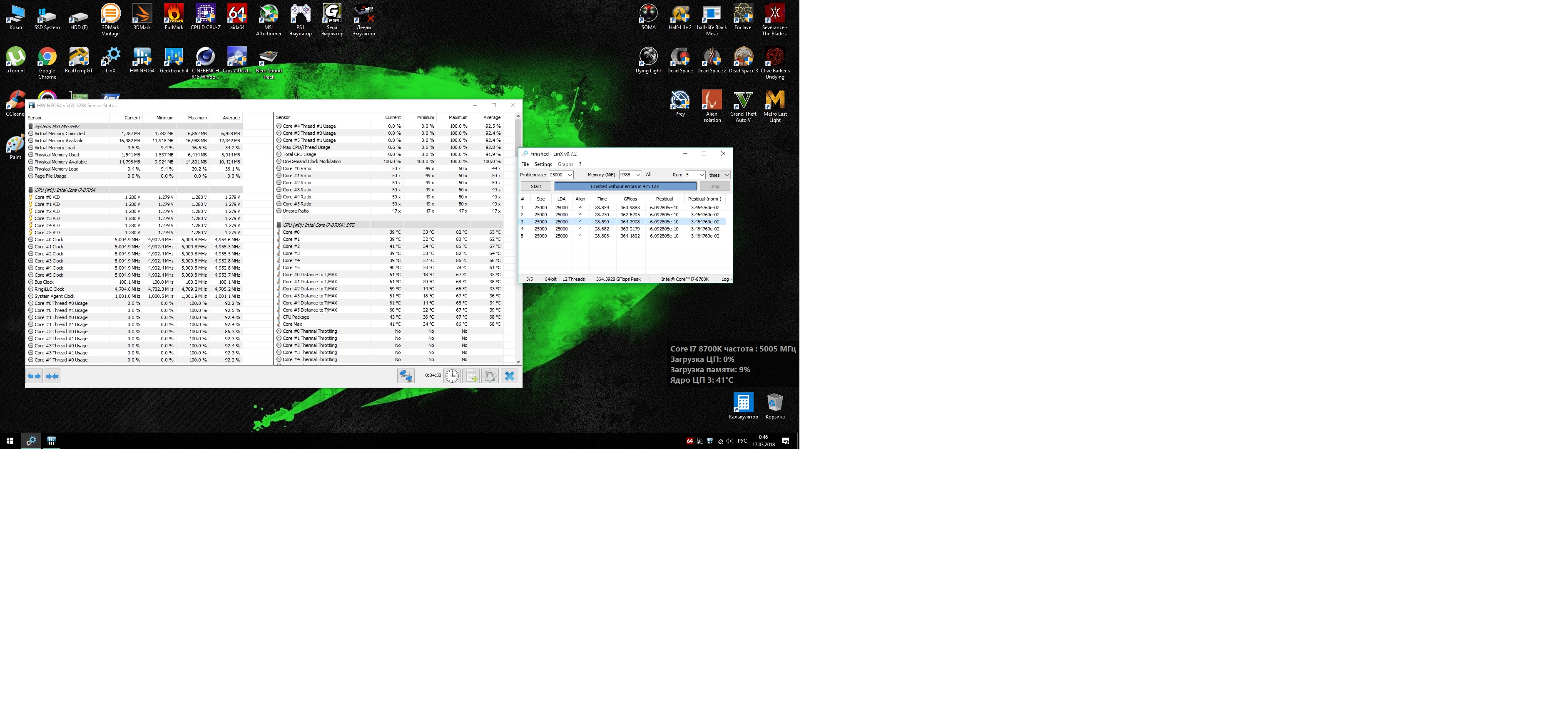 Полученный результат должен иметь следующий вид: Скриншот рабочего стола после прохождения >9 циклов (т.е. между 9 и 10 проходами). Вместе с LinX на рабочем столе должны быть развернуты CPU-Z (первая вкладка) и Core Temp, это обязательный минимум. Такой набор программ даст информацию о напряжении и температурах под нагрузкой-простоем. По желанию можете добавить другие программы, показывающие дополнительную информацию о вашей системе, например третью вкладку CPU-Z, которая покажет модель материнской платы и версию BIOS. Пример результата разгона: Mad Max, 5100 МГц (AVX 0), i7-8086K, HT-ON, Cache 4700, Vcore=1.36V, Batch L805E123, Gigabyte Z370 Aorus Gaming 7 (bios F6), Be Quiet! Dark Rock Pro 4, ЖМ под HS, Windows 10 Pro 64-bit 1809, LinX 0.9.3 64bit.