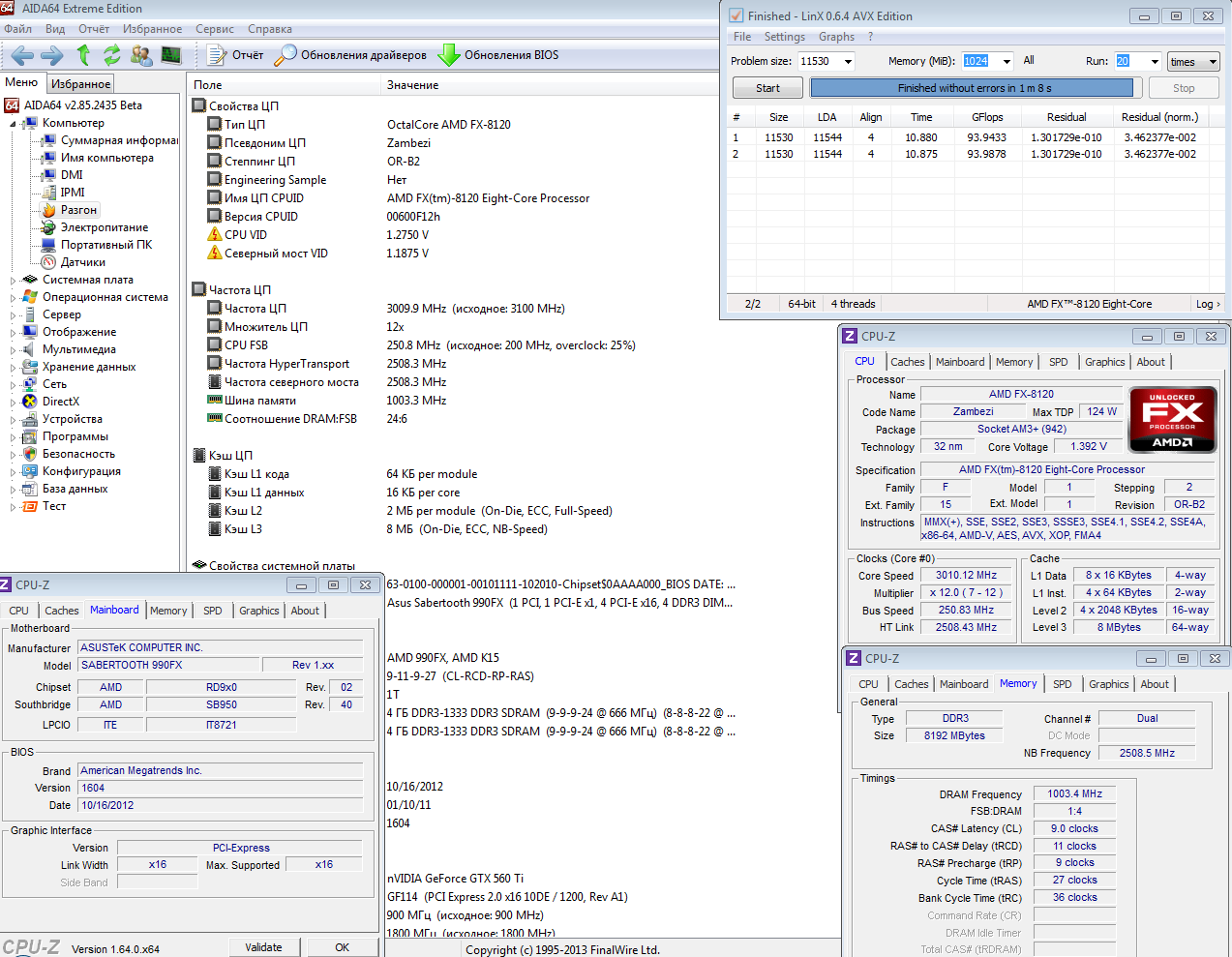 Логика 8хх и 9хх никак не могут влиять на результат в LinX, так как их задача связать процессор с периферией. Восьмая логика не совсем восьмая. Тот же AMD870 чипсет это старый AMD770, AMD880/AMD890GX=AMD760. Новшества коснулись лишь топового AMD890FX, но вскоре он стал AMD970/AMD990X... Нету восьмой логики как таковой, кроме 890FX.