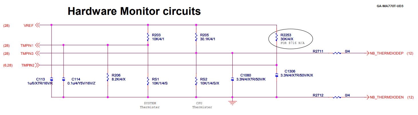 посмотрел схему 770t-ud3 -и вижу что идет tmpin2 на thermda sb600 ии ??? Где там указано что мониторится северный мост диод ???.начнем даже с того что на моей стоял южник другой sb750.что без T была она 2 -нет поддержки ддр3.пук твоей со схемой мимо -нет указания нигде на схеме что tempin2 мониторит северник