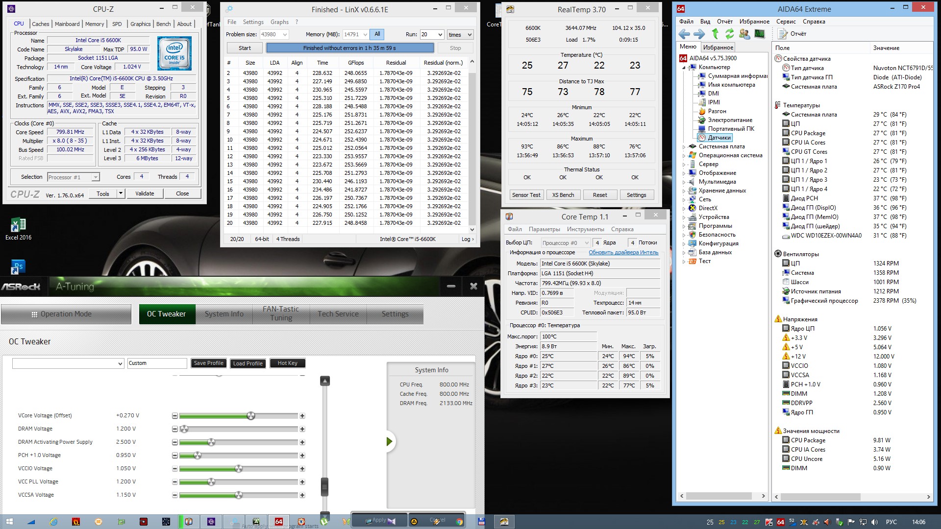 Не обнуляя настройки выставляю в биос 1.376 (биос округляет до 1.380)...в нагрузке имею опять свои 1.376 и - все так же как и было стабильно.