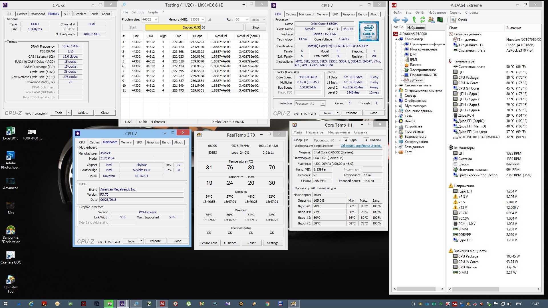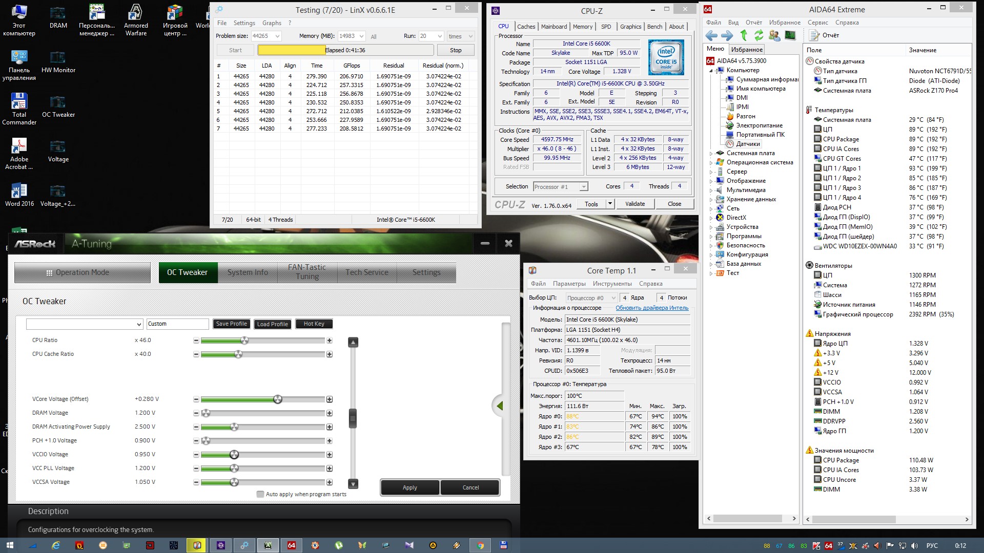 4.6Ггц 4.6 кеш память 2800 тайминги 11-11-11-29 1T для таких таймингов, пришлось поставить напрягу 1.425 на память! напряги в линксе при тесте 1.408 #77