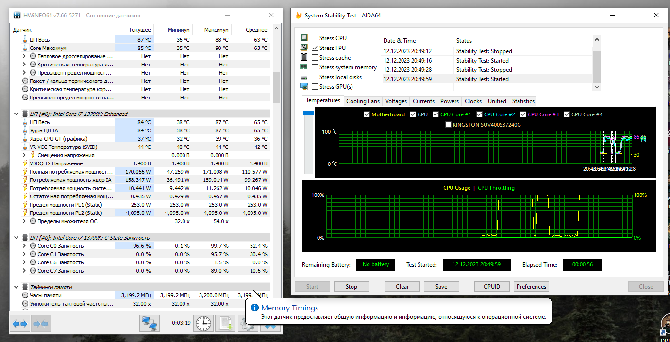 Прошу помощи. После сбора системы столкнулся вот с какой ситуацией. При тесте (напряжения) в ОССТ максимальная нагрузка на процессор 220W, температура 92-95 градуса. При совместном использовании prime95 и aida стало понятно, что процессор уходит в тротлинг. В биосе ставил только профиль XMP. Биос обновлен до последней версии. Помпа работает на максимум. Ограничений по процессору нет. Как добиться потребления ближе к 250? Возможно, я накосячил с установкой СЖО.