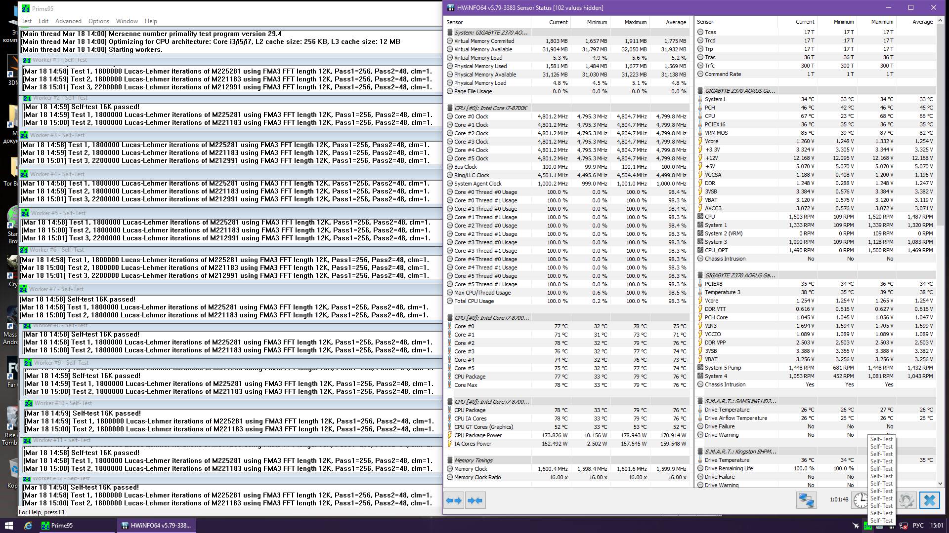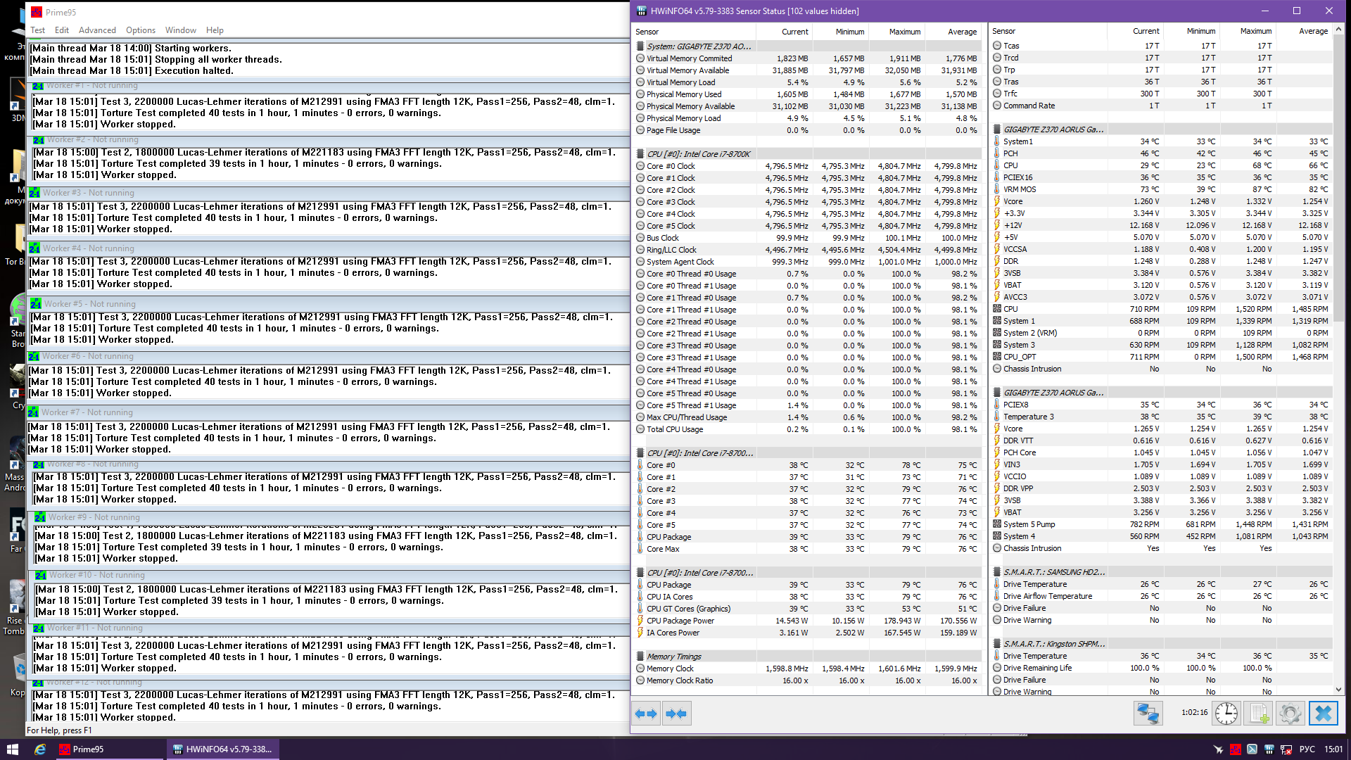 Sigumo 300+ флопсов на памяти 2133 и проце 4.3? там наверное веселые субтайминги стоят поставьте уже hwinfo и смотрите мин/макс значения, там хоть просадки и скачки видно будет. плюс asrock timing configurator для данных по таймингам. цпу-з и реалтемп по напряжениям и прочему дают информативности чуть меньше нуля.
