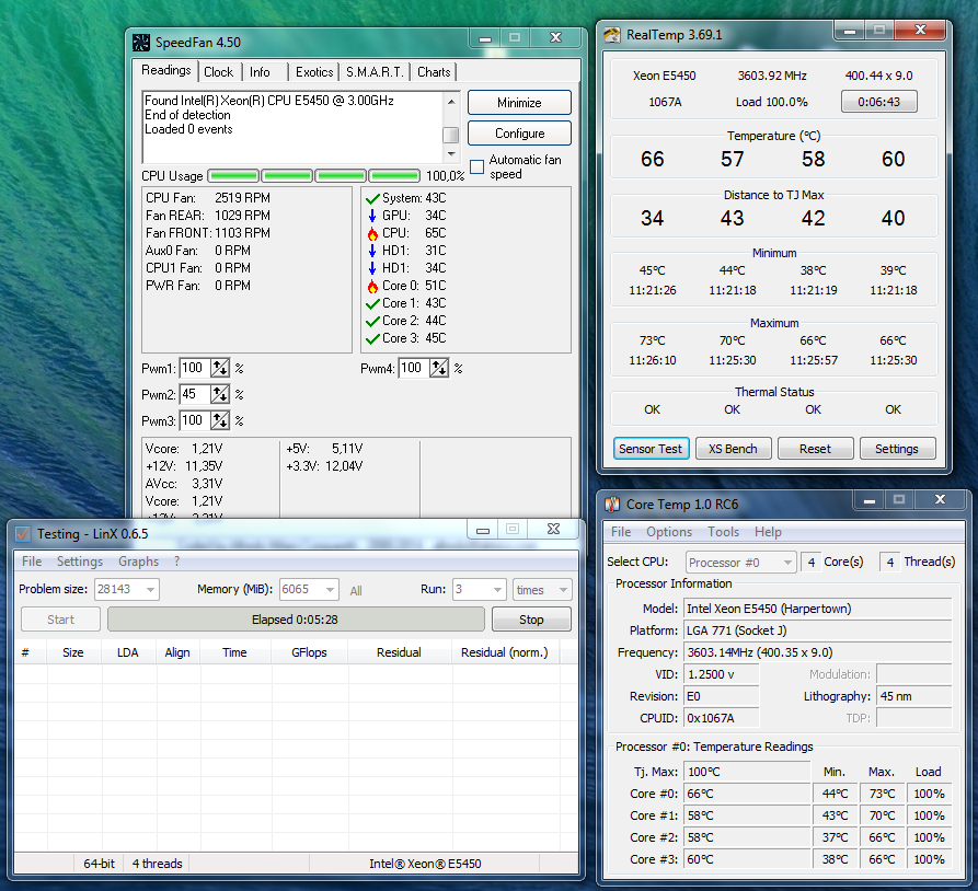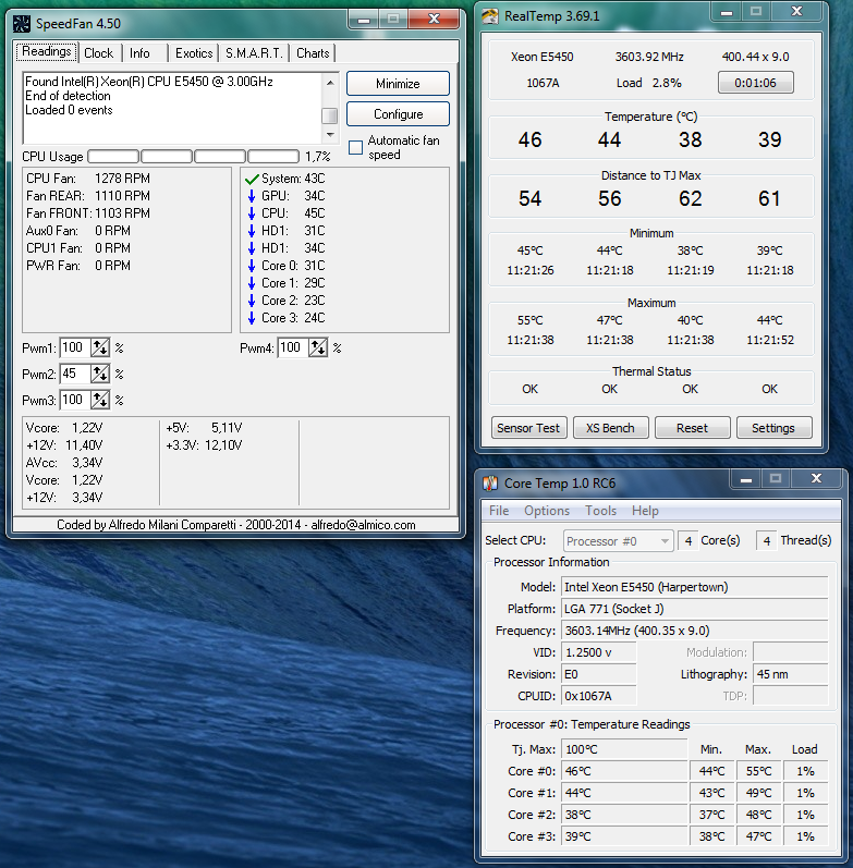 IdeaFix У меня к вам, земляк, вопрос, если можно. Я про температуру выше уже пытался узнать, но что-то внятно ничего не ответили, фак перечитывал. Связка у меня Asus P5Kpro + E5450, сейчас стоит 3,6ГГц и 1,25В. Так вот, собственно сам вопрос: CoreTemp, SpeedFan, RealTemp показывают различную температуру, причем в RealTemp от того какой выставить Tj.Max, такую температуру и покажет. Какой Tj.Max у Е5450 и где в системе он прописан? Если он 85 - то верны показания SpeedFan, если же он 100 - то верны показания CoreTemp. Я так понимаю, что сейчас система считает что он 100 (винду не переставлял) и поэтому при полной нагрузке у меня обороты кулера 2600 становятся. Если я переставлю систему то поймет ли система что он 85 и не будет так задирать обороты кулера?