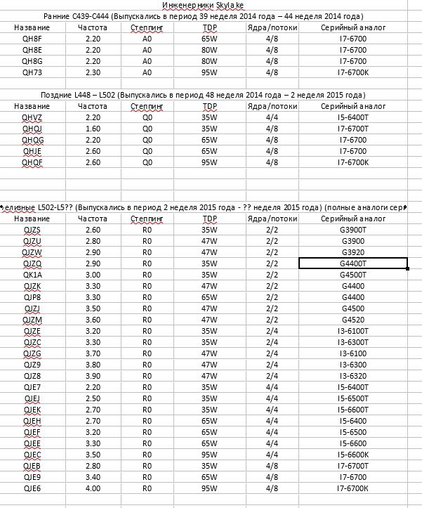 Что это за процессоры? Инженерные версии процессоров Skylake. В стоковом состоянии работают на заниженной частоте от 1,6 до 2.6ГГц. Все остальные параметры полностью соответствуют серийным образцам.