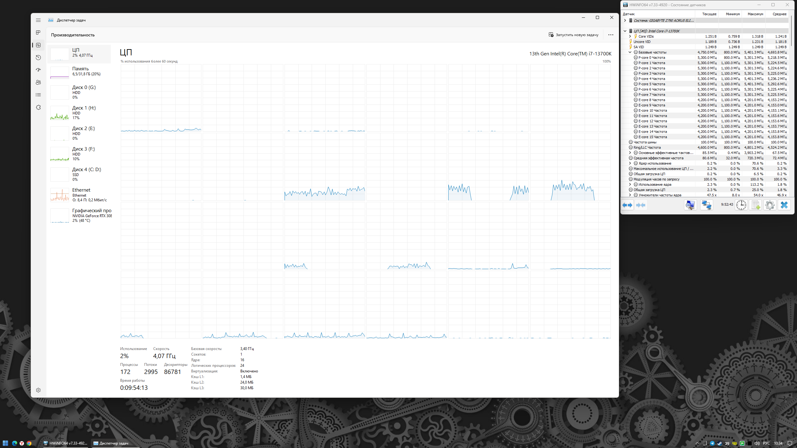 У меня очень неохотно скидывает частоты в простое, HWiNFO показывает, что частоты держатся 5.3/4.2 99% времени. Конечно, у меня режим простоя не совсем idle: раздаются торренты активно, запущено 3-4 мессенджера, дискорд, пара программ мониторинга. Но 5,3 ГГц и 2% загрузки процессора - это странно. Старый 9700K не держал всего свои 4.6 ГГц. В воскресенье переставил win11 начисто (мне не сложно, программ почти нет) - и на голой винде hwinfo показывает то, что я ожидаю увидеть: частоты прыгают 800-1100-2200-4200, иногда 5,3. Как и должно быть. Начинаю устанавливать софт и на каком-то моменте ситуация становится "как обычно". Но не понял, на каком. Может после установки родного Gigabyte Control Center? Он нужен, чтобы подсветку контролировать и выключить. Непонятно.