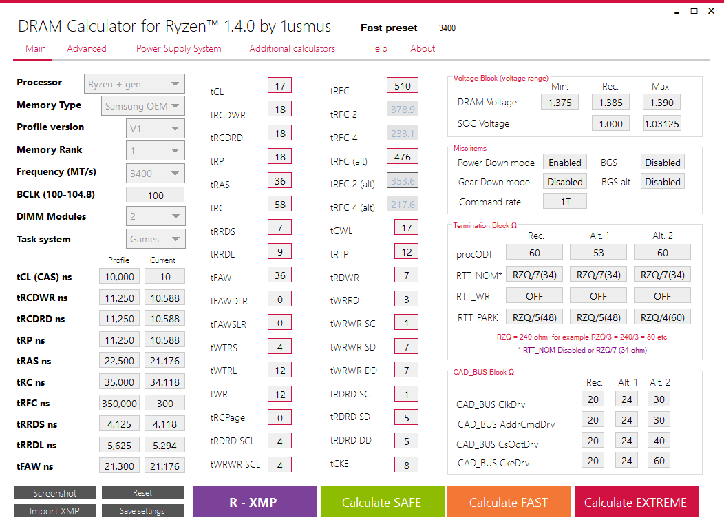 Изменения: * Добавлена начальная поддержка Threadripper gen 1 и gen 2 * Улучшено прогнозирование напряжения SOC для разных процессоров и их поколений * Дополнительное окно, в котором будет указано, какое минимальное напряжение DRAM требуется системе * Дополнительные окна, которые показывают наносекундную задержку для текущего расчетного профиля. Это будет особенно полезно для пользователей, которые прошивают SPD * Улучшено предсказание procODT + RTT + CAD_BUS для некоторых типов памяти (блок перетерпел много изменений) * Улучшен разгон для Hynix CJR. До 3800 МГц включительно. Большое спасибо @Reous за помощь * Выбор типа задачи для системы , от этого переключателя зависят рекомендации BGS / BGSalt. Отключение BGS позволяет увеличить производительность в играх до 5% * Профиль «Custom» будет основываться исключительно на таймингах, размещенных в XMP. Его новое название - «Debug». Режим, разработанный с нуля, доступен почти для всех чипов (но все же нужно некоторое время для более тонкой конфигурации). Я считаю, что этот режим необходим для профессионалов, которые хотят видеть все изменения относительно автоматического разгона или профиля XMP. Это позволит им увидеть некоторые нюансы, которые не могут обеспечить профили «V1» и «V2». Также этот режим будет полезен владельцам систем на базе процессоров Intel. * Некоторые изменения в procODT + RTT для систем, в которых 4 модуля RAM SR * Добавлена поддержка Micron D-die * Изменения в коде, которые помогут ускорить разработку калькулятора (будущие версии) * Добавлено несколько всплывающих подсказок для ключевых настроек и форм * Новое изображение в папке Configuring Ryzen Systems v5 * Исправления ошибок