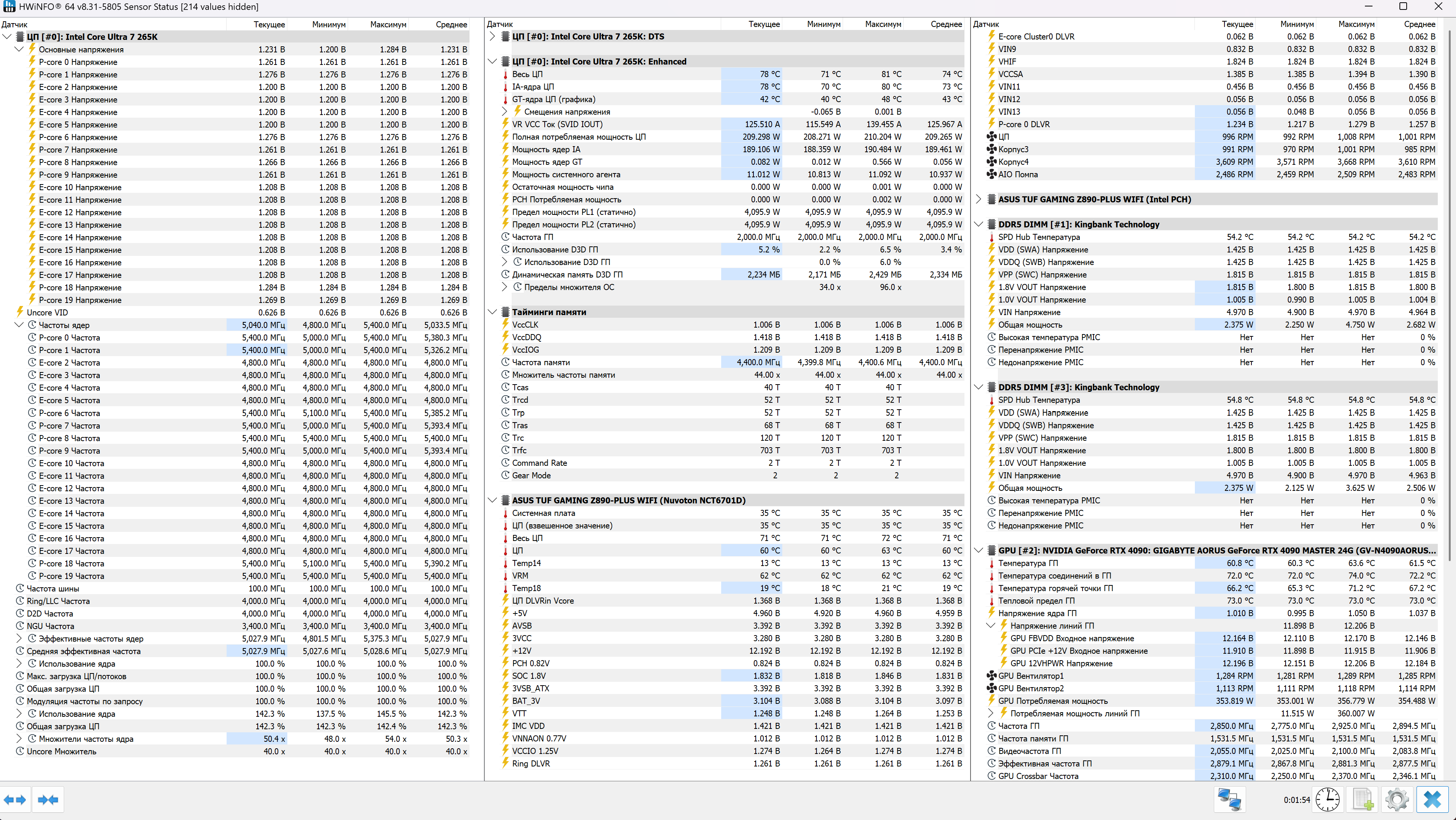 Развернул на скрине частоты и прочие данные. Взгляните, пожалуйста. За температуры проца вообще не переживаю (на скрине видно, что всё норм, кулер Assassin IV VC Vision успешно справляется), а вот с вольтажом и прочей инфой не уверен. Кстати, 4 градуса Цельсия, зарегистрированных в минимуме, на одно из P-ядер - явно баг софта.