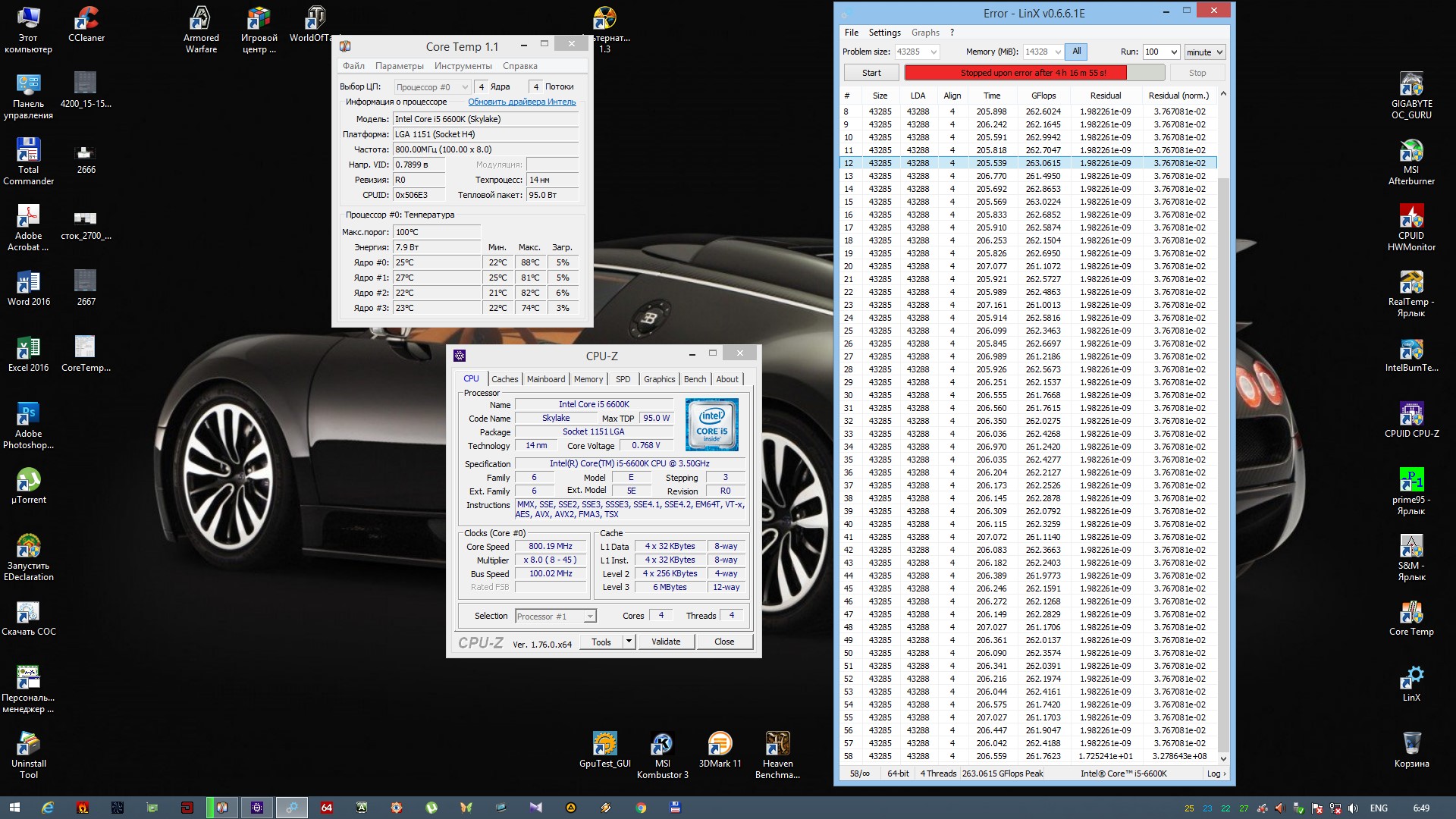 mirumir2016 напруга занижена, в Linx "невязка"(то бишь Residual) и всё что сней связано должно быть одинаковые значения как близнецы в каждом столбце - иначе, косяк, гфлопс могут только отличаться. Мониторь дальше.. З.ы. Linx выдал ошибку после 4 часов в реале на всю память - из-за разгона ядер 4500\4100\1.325v - навряд ли, тестил со стоковой памятью 300 минут, всё прошло, а с памятью 2666\133 делитель\1.2v\vccio\vccsa- 1.150\1.250\ PCH +1 - 1.150 - похоже не хочет, Прайм наверное можно тоже пока не запускать...Вот и думаю, что поднять - напругу на память? и ли частоту снизить до 2600? Тест S&M 1.9.1 - пройден успешно.