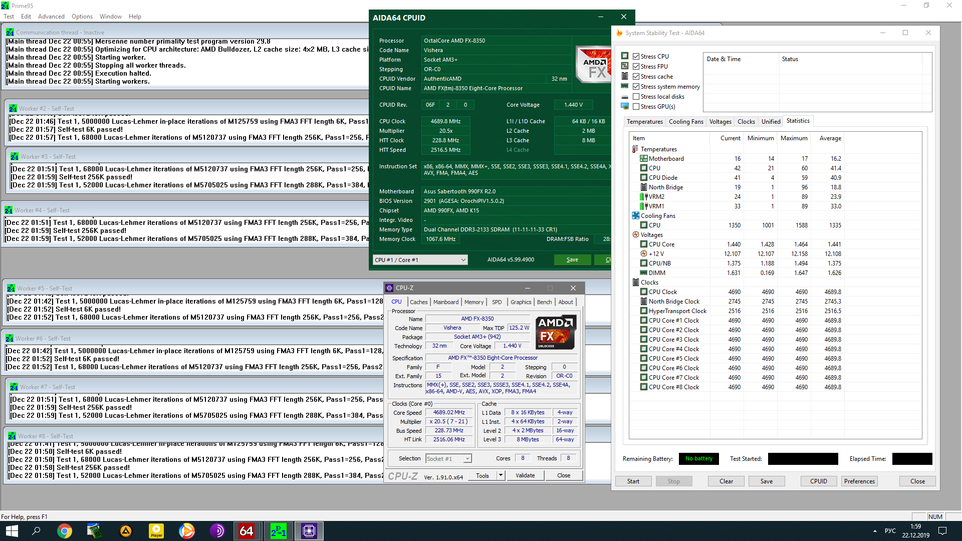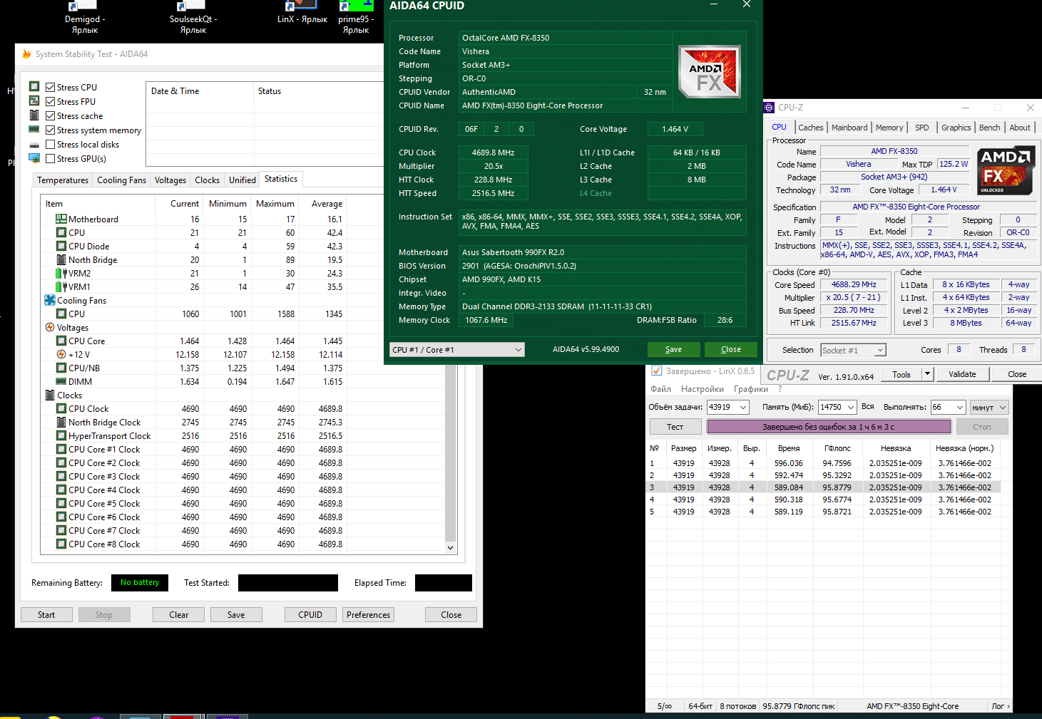 Итак, как только мне поведали про глючный тайминг cr, начал гнать всё заново, по шине уже) Имею по биосу: 4674 ядра, КП 2736, память 2127 11-11-11-33 CR1T. Накидывал напруги- нестабильно и горячо, или наоборот) Prime 95 стабилен больше часа, температуры нормальные. Linx avx уже горячее, открываю окно, пик самого горячего датчика- 60 на cpu, палец везде держать можно. Проги и игры не вылетают, в простое самый горячий датчик 34, поиграл 40 минут сейчас в roe- проц грузится на 60%, самый горячий датчик 55. Cinebench 1488 баллов) при шине 228))0 Скрины да, не по чесноку, но я в статистику не претендую, прост поделиться пришёл И да, можно на шаг скинуть напругу на кп, стабильно, но критично падает чтение с L3.