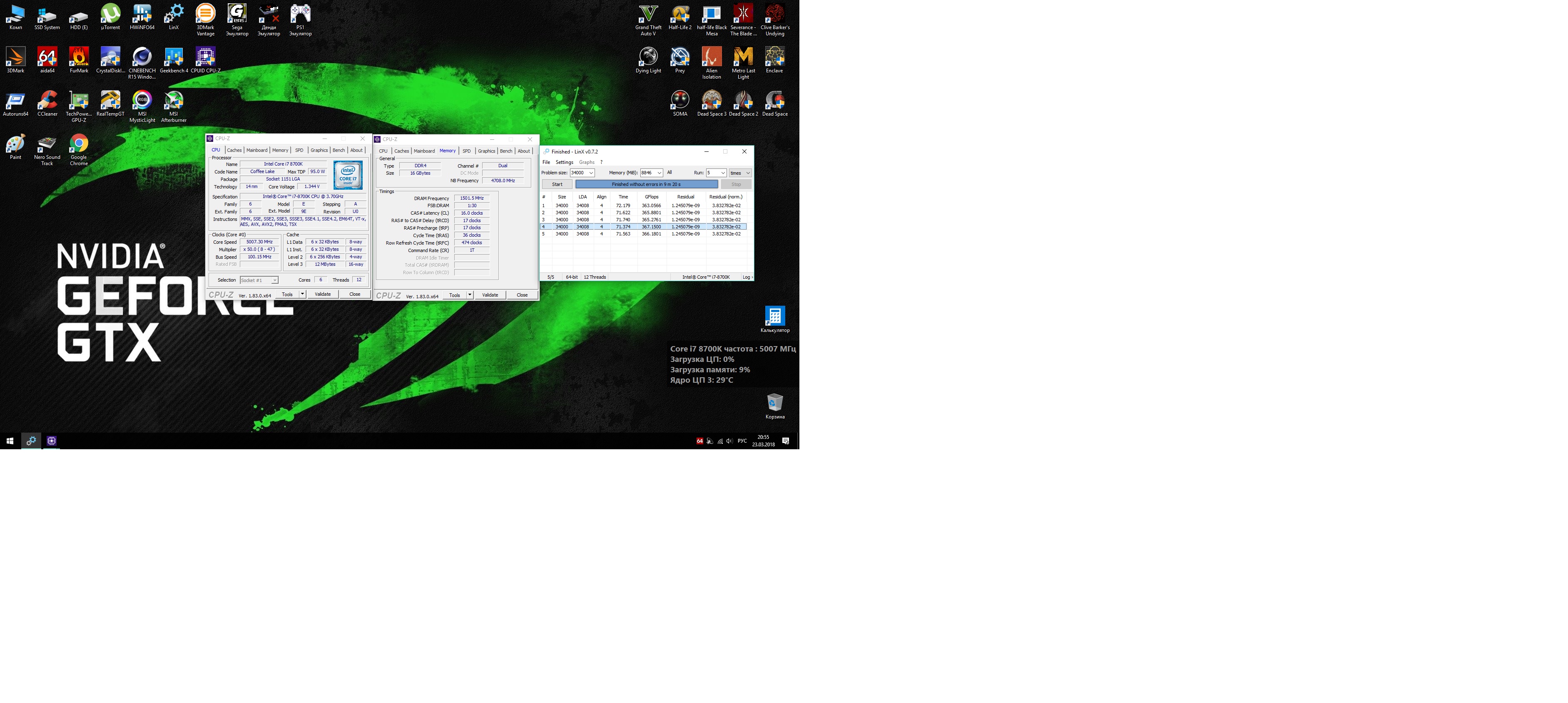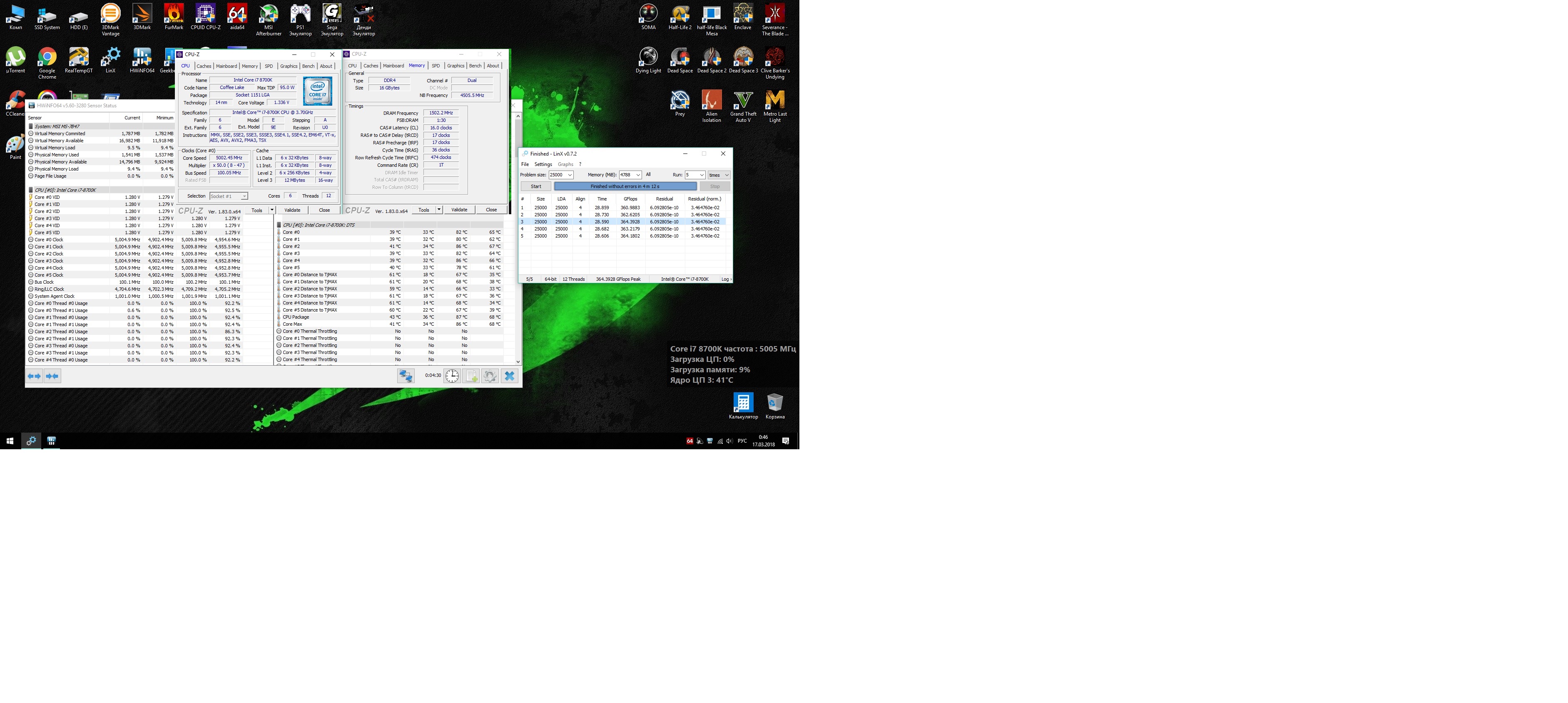 Полученный результат должен иметь следующий вид: Скриншот рабочего стола после прохождения >9 циклов (т.е. между 9 и 10 проходами). Вместе с LinX на рабочем столе должны быть развернуты CPU-Z (первая вкладка) и Core Temp, это обязательный минимум. Такой набор программ даст информацию о напряжении и температурах под нагрузкой-простоем. По желанию можете добавить другие программы, показывающие дополнительную информацию о вашей системе, например третью вкладку CPU-Z, которая покажет модель материнской платы и версию BIOS. Пример результата разгона: Mad Max, 5100 МГц (AVX 0), i7-8086K, HT-ON, Cache 4700, Vcore=1.36V, Batch L805E123, Gigabyte Z370 Aorus Gaming 7 (bios F6), Be Quiet! Dark Rock Pro 4, ЖМ под HS, Windows 10 Pro 64-bit 1809, LinX 0.9.3 64bit.