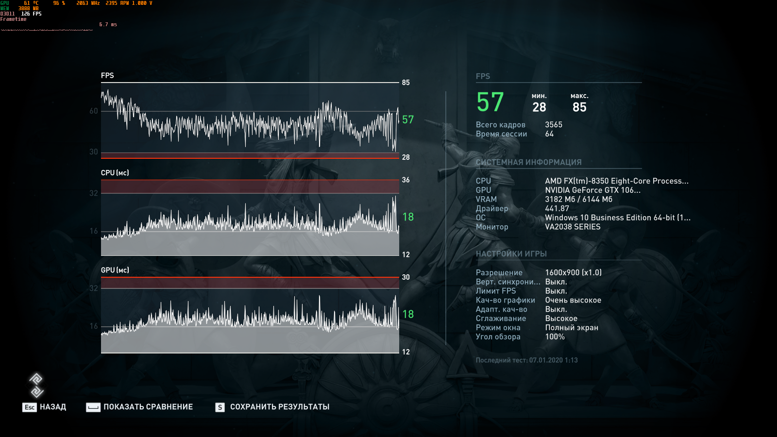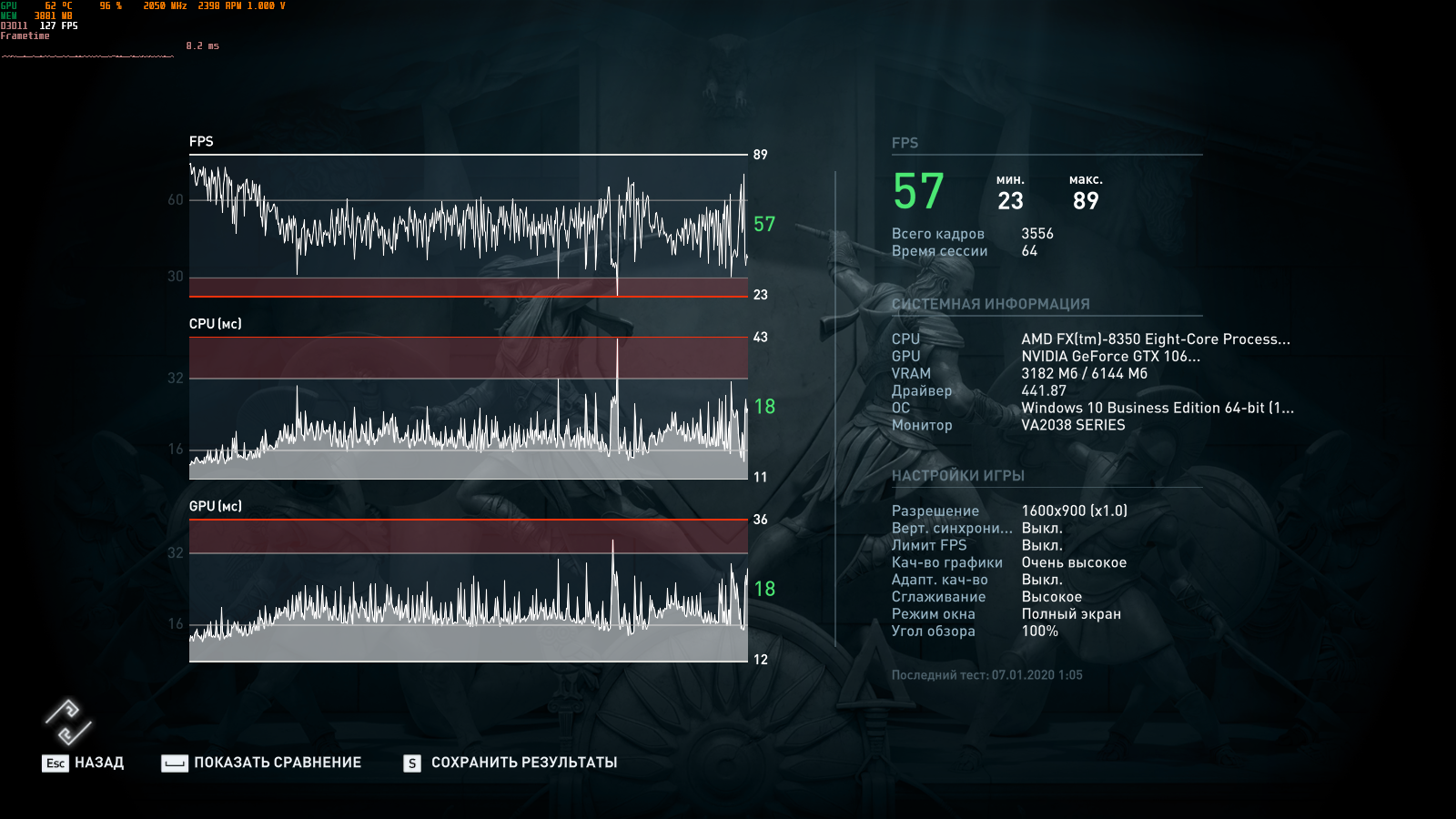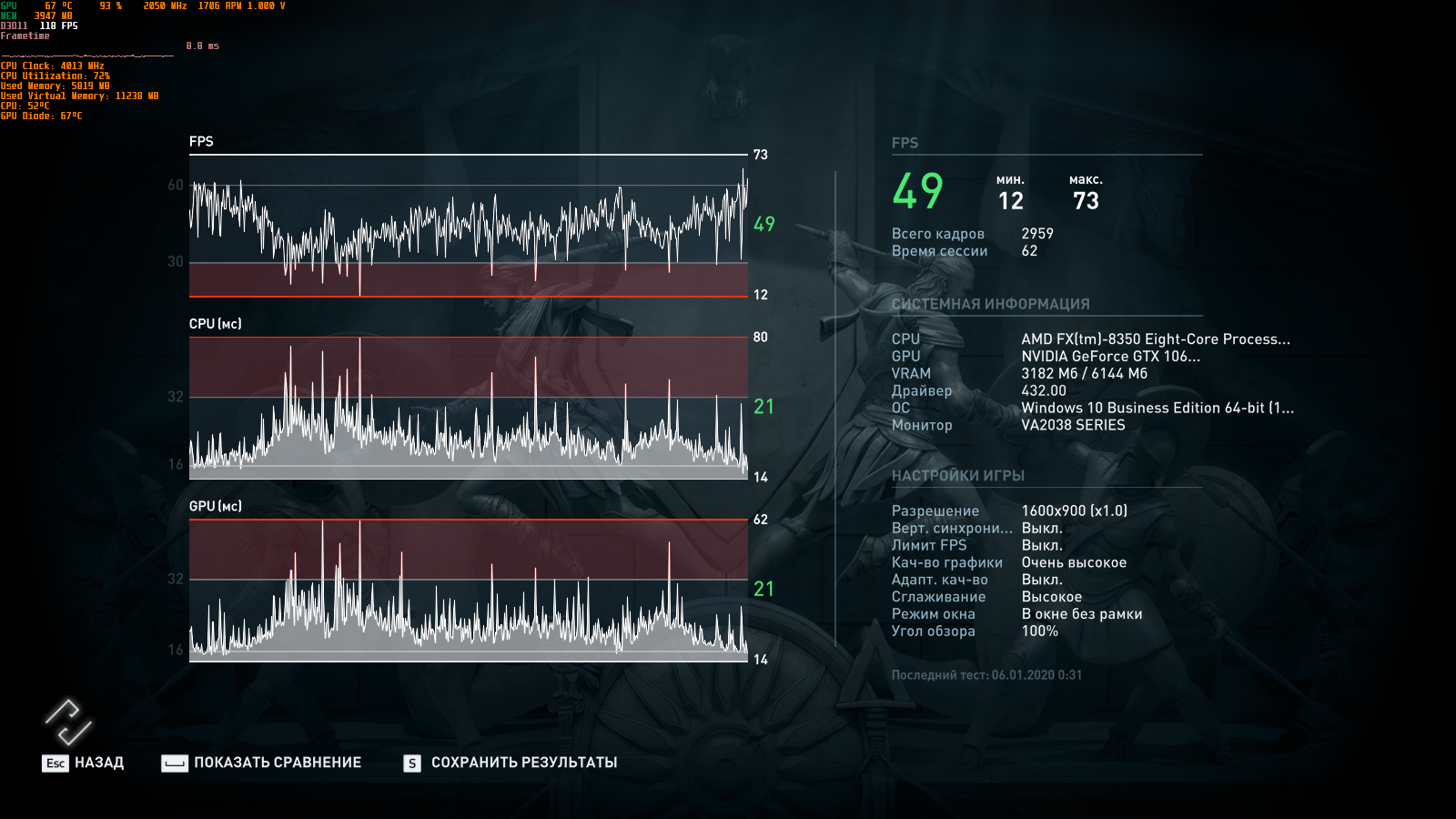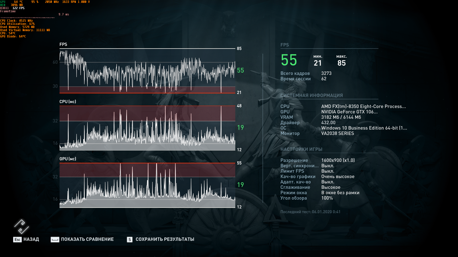 так же где то.А провалилось по минималке у тебя.потому что не на ссд.я уже заметил такое и до 1 кадра минималки фризы бывают в этом тесте.И да -у тебя резалты не очень для Очень высокого пресета Вот мои для 1600 на 900 4550/2680 2088/9315 : #77 выше заметно все же у меня при прочих равных