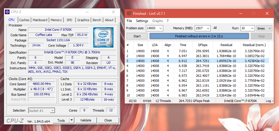 Полученный результат должен иметь следующий вид: Скриншот рабочего стола после прохождения >9 циклов (т.е. между 9 и 10 проходами). Вместе с LinX на рабочем столе должны быть развернуты CPU-Z (первая вкладка) и Core Temp, это обязательный минимум. Такой набор программ даст информацию о напряжении и температурах под нагрузкой-простоем. По желанию можете добавить другие программы, показывающие дополнительную информацию о вашей системе, например третью вкладку CPU-Z, которая покажет модель материнской платы и версию BIOS. Пример результата разгона: Mad Max, 5100 МГц (AVX 0), i7-8086K, HT-ON, Cache 4700, Vcore=1.36V, Batch L805E123, Gigabyte Z370 Aorus Gaming 7 (bios F6), Be Quiet! Dark Rock Pro 4, ЖМ под HS, Windows 10 Pro 64-bit 1809, LinX 0.9.3 64bit.