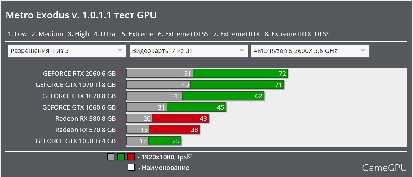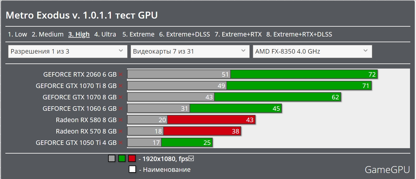4. Metro exodus. на высоких настройках разницы нет, упор в ВК
