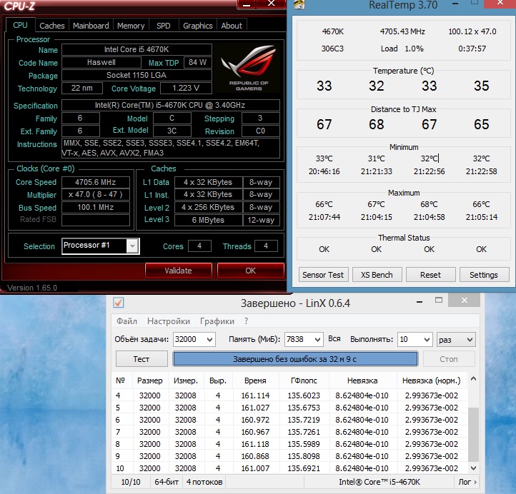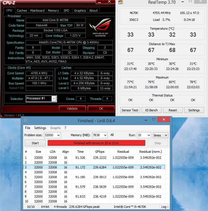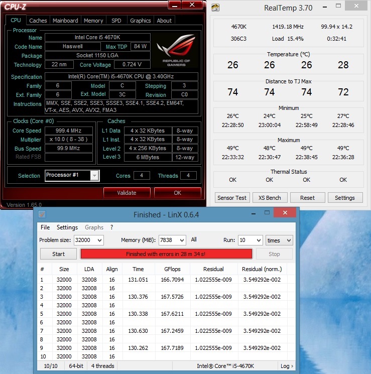 Спасибо, почти работает. Считает, греет, но потом пишет ошибку. И это не из за разгона, прогнал на дефолтных - тоже самое и последние 2 столбика сходятся. Отдельно прогнал сам линпак с avx2 - та же температура, те же гигафлопы.