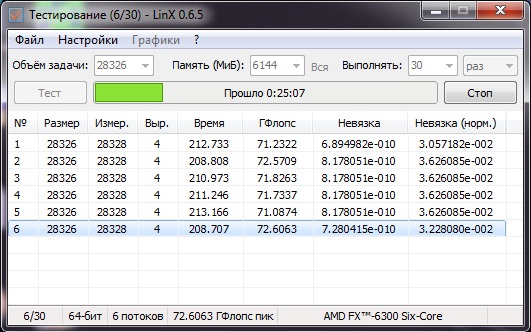 да от увеличения обьема задачи - увеличиваются Гфл.. но так сказать не пропорционально естественно.. разница например 500мб и 8Гб может доходить до 10Гфл к примеру, а вот разница между 6 и 8 уже порядка 0.5-1Гфл как то так.. ну и как сказали проходы дольше по времени - а это значит время нагрева CPU больше ...