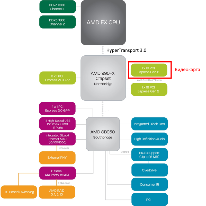 Тут видно, что при увеличении скорости HT, по идее увеличивается скорость отдачи от видеокарты... На моем примере. У меня для двухканала на 1600 МГц ОЗУ, ПСП (пропускная способность памяти) = 25600 Мбит/с, а шина HT 3.0 дает на 970-ом чипсете 2400 МГц в номинале. Вычисляем ПСП Hypertransport 3.0: Пропускная способность HT (ПС HT) = Частота передачи (f) x разрядность шины (c) x количество каналов памяти(k) = 2400 МГц х 16 бит х 1 = 38400 Мбит/с Итого: Hypertransport 3.0 -> 38400/8 = 4800 Мбайт/с DDR3-1600 Dual -> 25600/8 = 3200 Мбайт/с Делим на 8, чтобы перевести Мбит/с в Мбайт/с (в 1 байте 8 бит). PCI-E 2.0х16 = 8000 Мб/с (PCI Express 2.0 это 8 Гб/с то PCI Express 3.0 это 16 Гб/с)