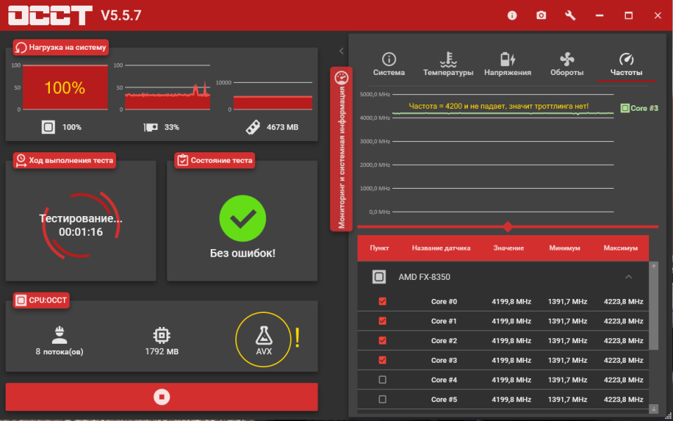 Bigsun OCCT нормальная прога, но на вкус и цвет - карандаши разные ... судя по скринам, вы запускаете OCCT с нагрузкой на 4 ядра и со средней задачей... откройте диспетчер задач - какая там нагрузка на CPU посмотрите.. я не могу понять 50% что ли .. тротлинг на AMD - это не падение частот (хотя бывает и так, на некоторых матерях) , а в том что при разгоне из за слабой системы питания - процессор просто не выдает нужной производительности стабильность при этом может сохранятся, при разгоне памяти - используйте Prime режим Blend для проверки стабильности