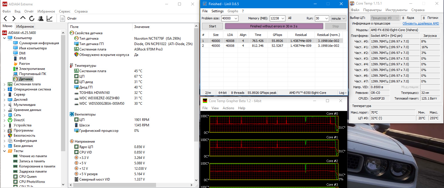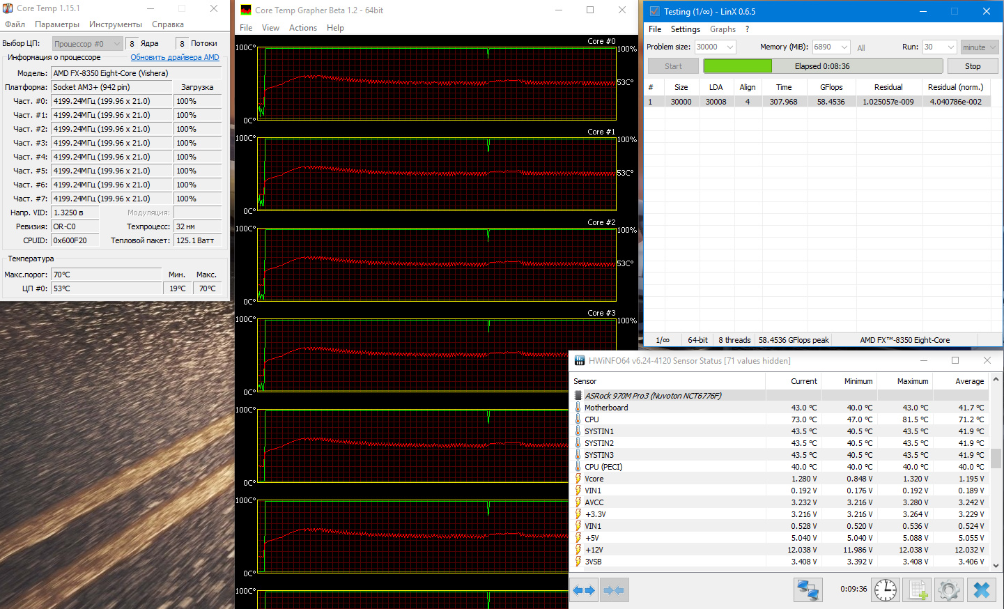 LinX 30 минут. Без ошибок. 4200 МГц. 74 град макс.