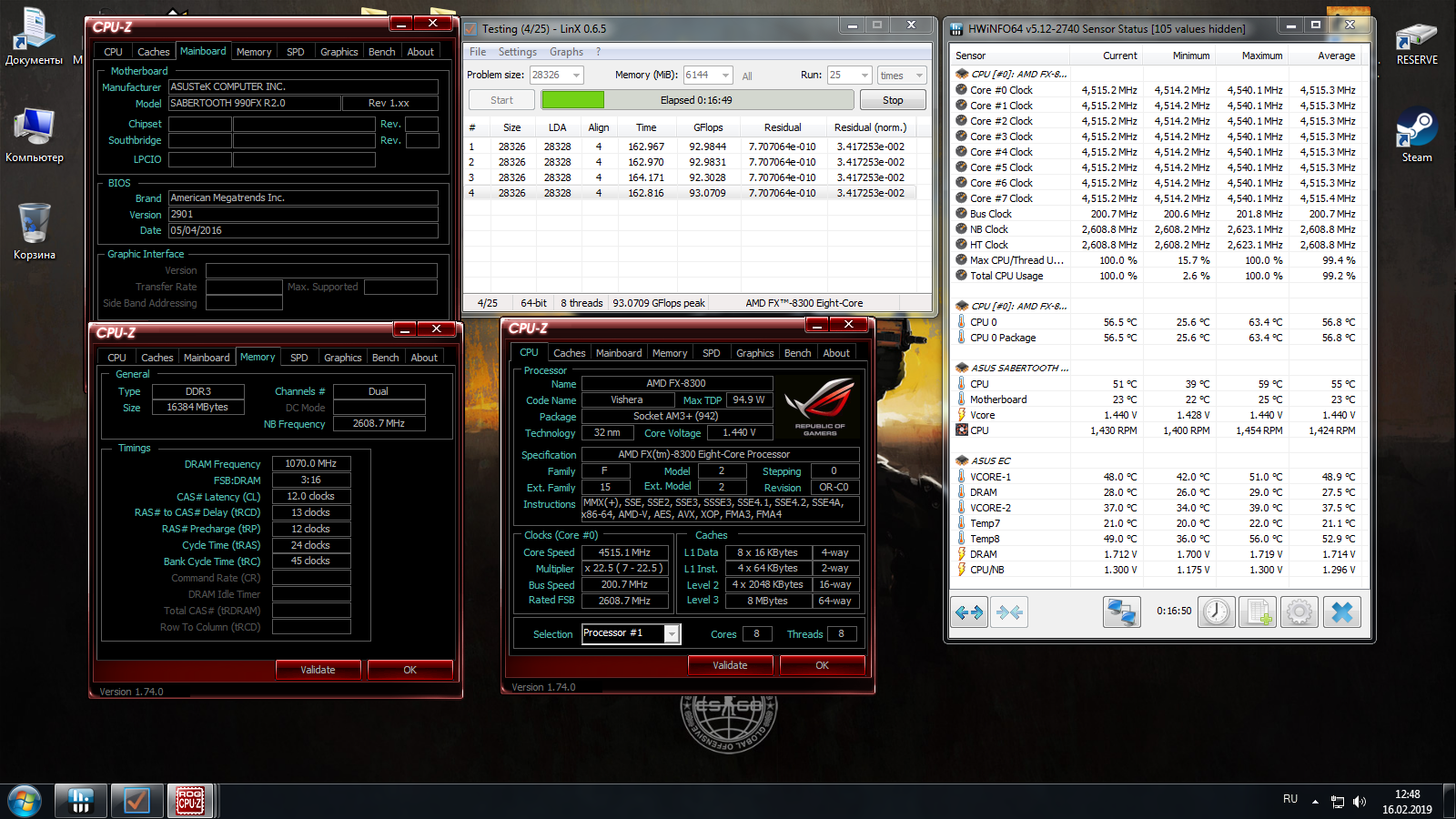 Вообще без проблем, это мне никаких усилий не стоило. Я же выложил все настройки биоса и показания датчиков. Видно же температуру материнки. В ЭТОЙ комнате (где компьютер стоит) нет кондиционера вообще. Могу попробовать ещё поднять ради любопытства. Большую часть напряжений мать сама в автомате выставили, это тоже видно на моих скринах.