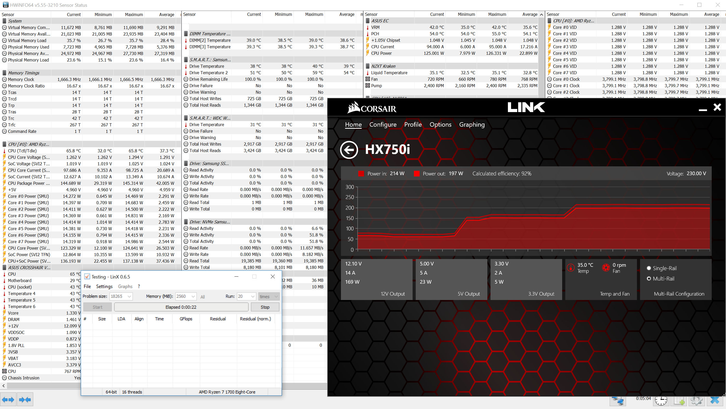 - Обычно поставляется в небольшой коробке без СО. - Штатно имеет базовую частоту 3.4ГГц, частоту 3.5ГГц (технология Turbo Boost) при обычной многопоточной нагрузке (Blender n-cores render) и 3.9ГГц (технологии Precision Boost и XFR) при однопоточной нагрузке (Cinebench R15 single core). - Штатное напряжение питания 1.35В. Может возрастать до 1.4В на отдельных ядрах во время работы Precision Boost и XFR. - Энергоэффективность средняя, требования к СО (TDP) - 95W. Энергопотребление порядка 13Вт в простое и 120Вт в обычной многопоточной нагрузке (Blender n-cores render). - По сравнению с R7 1700 имеет увеличенный промежуток XFR (100МГц вместо 50МГц), а также увеличенные технологией SenseMI показатели температуры на 20 градусов (например, 90 при реальных 70).