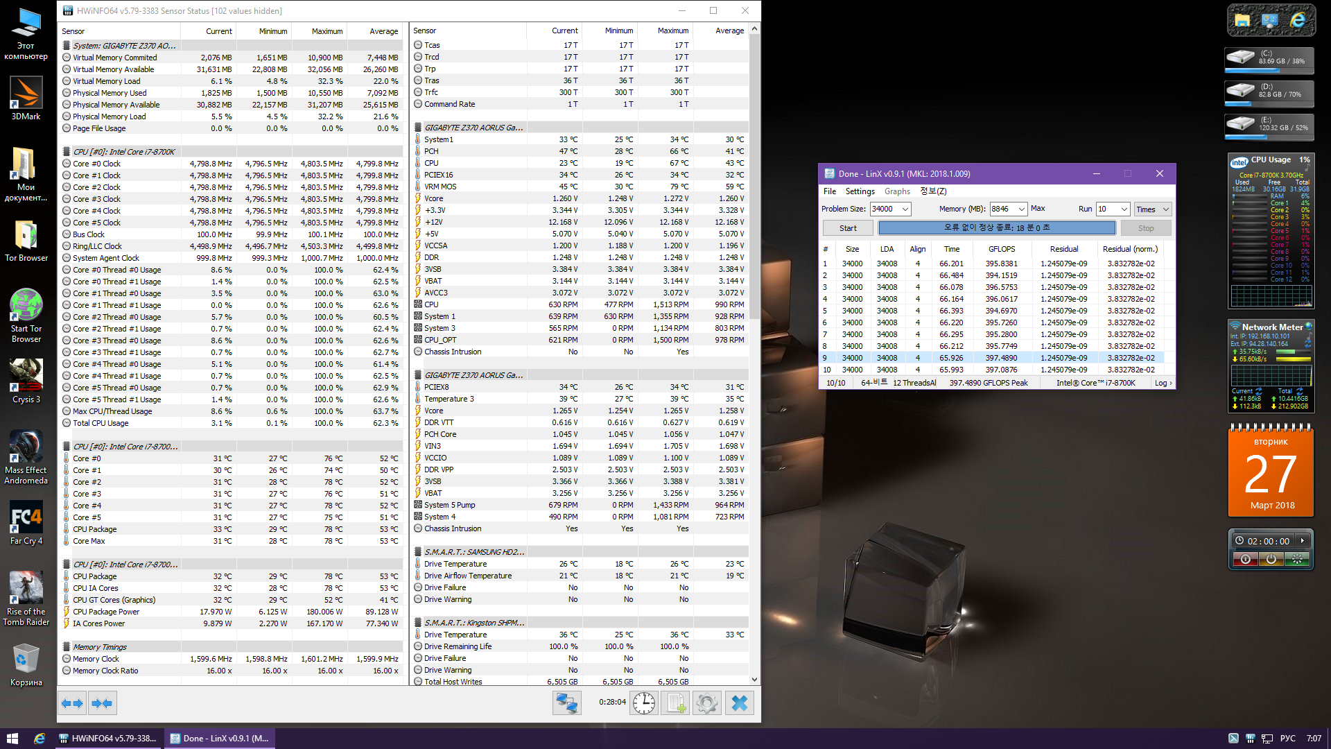 Полученный результат должен иметь следующий вид: Скриншот рабочего стола после прохождения >9 циклов (т.е. между 9 и 10 проходами). Вместе с LinX на рабочем столе должны быть развернуты CPU-Z (первая вкладка) и Core Temp, это обязательный минимум. Такой набор программ даст информацию о напряжении и температурах под нагрузкой-простоем. По желанию можете добавить другие программы, показывающие дополнительную информацию о вашей системе, например третью вкладку CPU-Z, которая покажет модель материнской платы и версию BIOS. Пример результата разгона: Mad Max, 5100 МГц (AVX 0), i7-8086K, HT-ON, Cache 4700, Vcore=1.36V, Batch L805E123, Gigabyte Z370 Aorus Gaming 7 (bios F6), Be Quiet! Dark Rock Pro 4, ЖМ под HS, Windows 10 Pro 64-bit 1809, LinX 0.9.3 64bit.