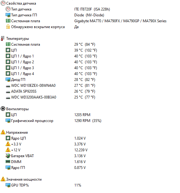 Spike Rus Ну здесь ЦП и датчики ядер неплохо коррелируют 39 и 40. Но вообще посмотри какая температура по ЦП под нагрузкой, ну так чтобы сильно не жарить, в сайнбенче или типа того. Если по ЦП покажет +- тоже самое что и в игре - значи ттак оно и есть. Причем это подсокетный датчик. За одно какое фактическое vcore под нагрузкой посмотри. В стоке там порядка 1.35v должно быть с просадкой в миливольт 20-30, то есть в итоге 1.32-1.33 вольта.
